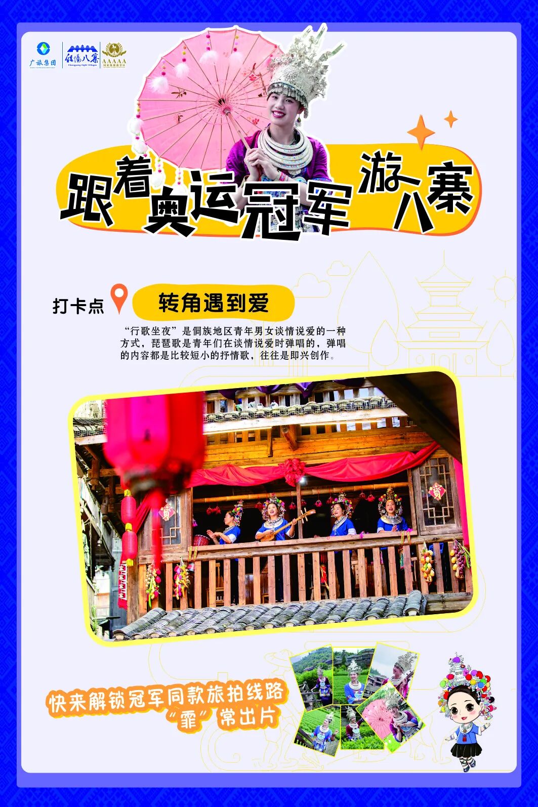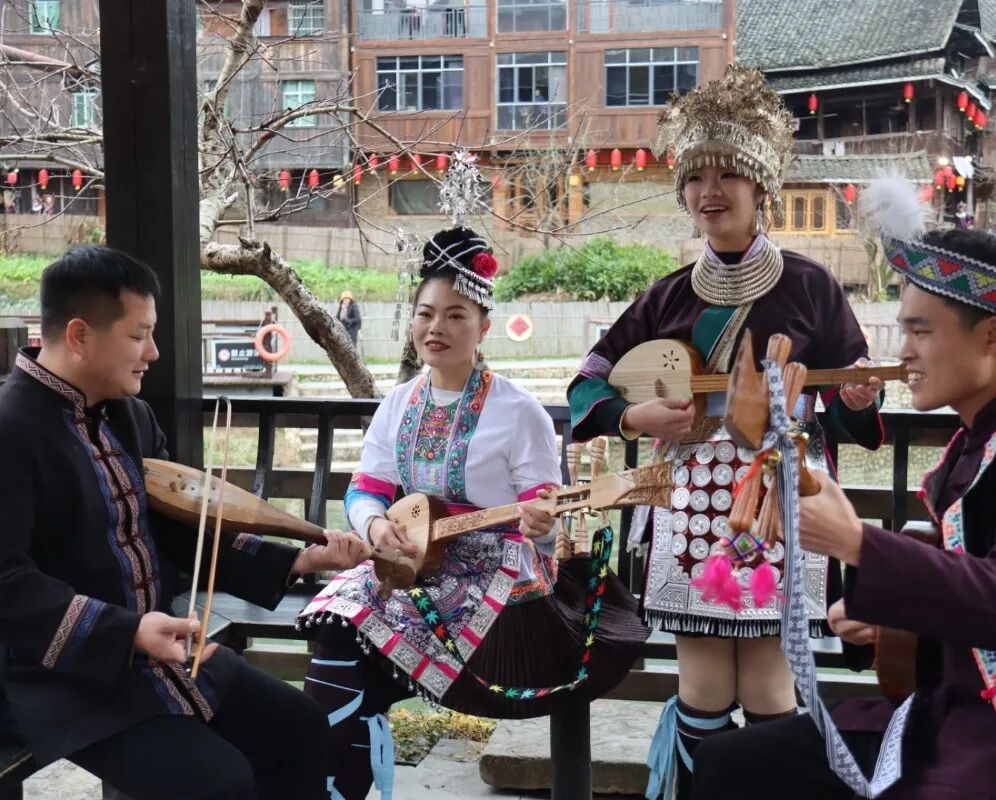 到“转角遇到爱”的琵琶弹唱下接一个侗族吉祥花;看看竹筏悠悠游下林溪河,再听听岸边传来的侗笛演奏,侧耳感受侗族的情歌对唱。