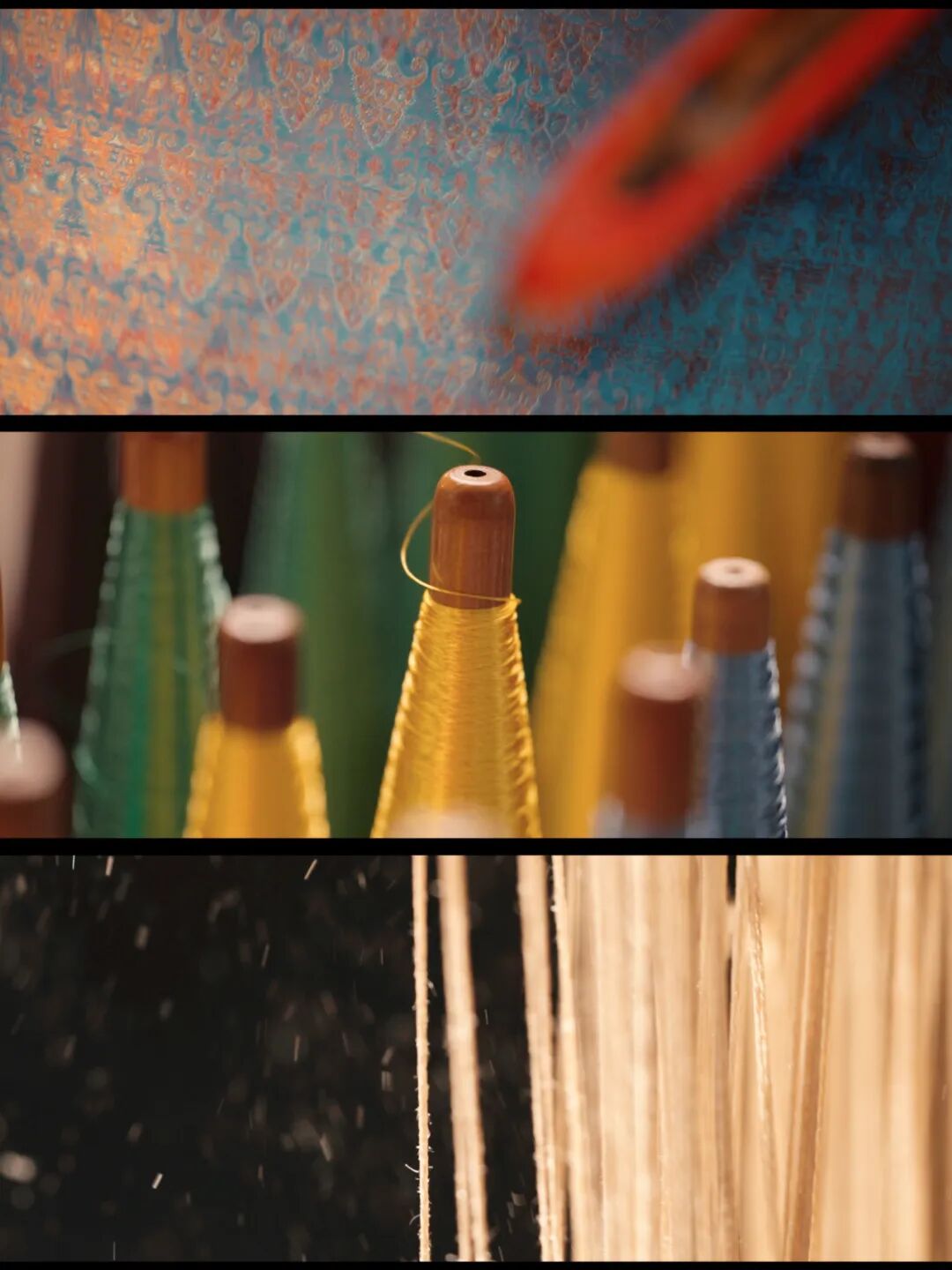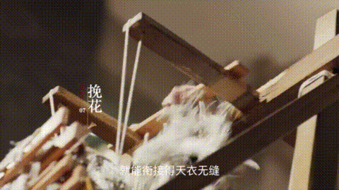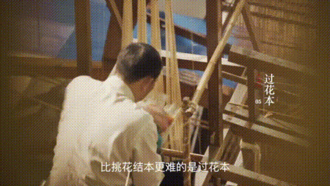 挽花是控制图案,投梭是控制颜色。楼上的挽花工,用正确的力度在一万多根线中拽出其中正确的部分;而投梭工则需要依照既定的顺序,把两斤重的梭子在细腻的丝线中流畅甩出。