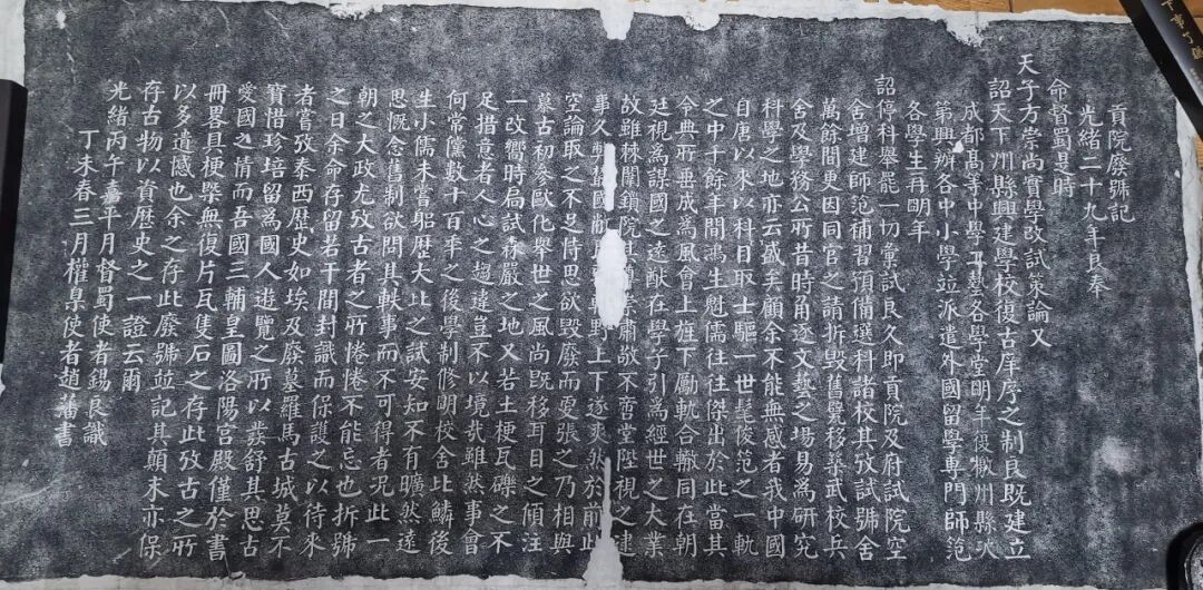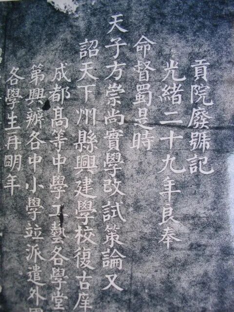 虽然事会何常,傥数十百季之后,学制修明,校舍比鳞,后生小儒未尝躬历大比之试,安知不有旷然远思,慨念旧制,欲问其秩事而不可得者,况此一朝之大政,尤考古者之所惓惓能忘也。拆号之日,余命存留若干间,封识而保护之,以待来者,尝考泰西历史如埃及废墓、罗马古城莫不宝惜珍培,留为国人浏览之所,以发舒其思古爱国之情,而吾国三辅皇图、洛阳宫殿,仅于书册略具梗概,无复片瓦只石之存,此考古之所以多遗憾也。余之存此废号并记其颠末,亦保存古物,以资历史之一证云尔。光绪丙午嘉平月督蜀使者锡良识,丁未春三月权臬使者赵藩书。