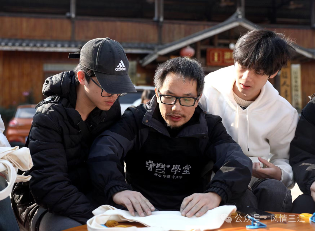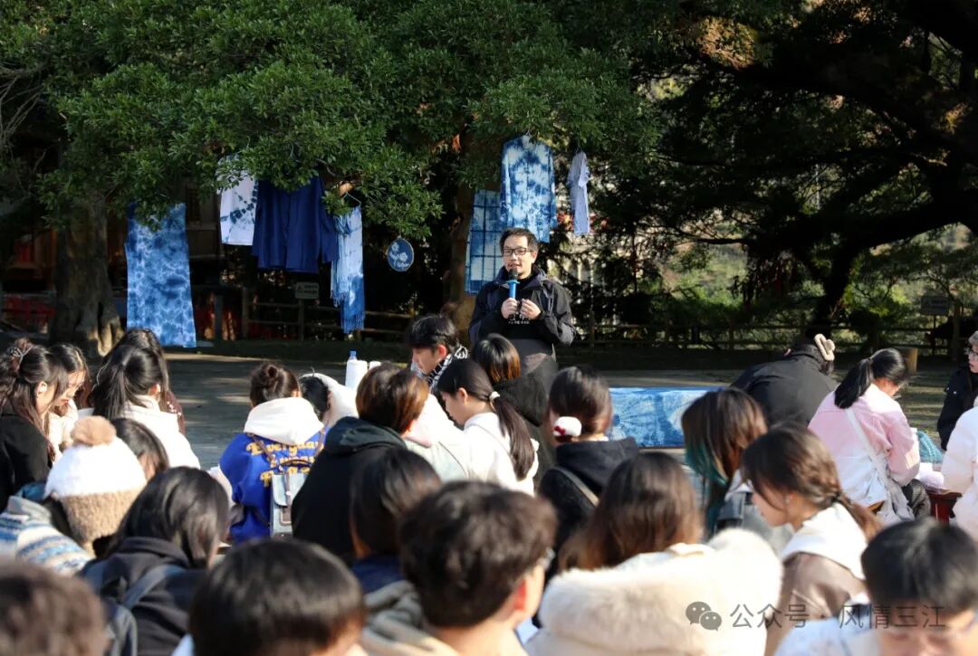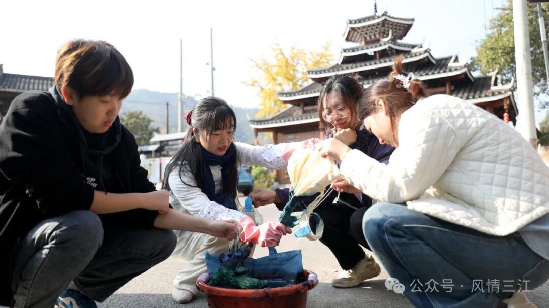 12月18日,广西外国语学院100余名师生到三江侗族自治县三江口生态旅游区产口古榕景区开展扎染体验活动,“零距离”感受非遗多彩魅力。