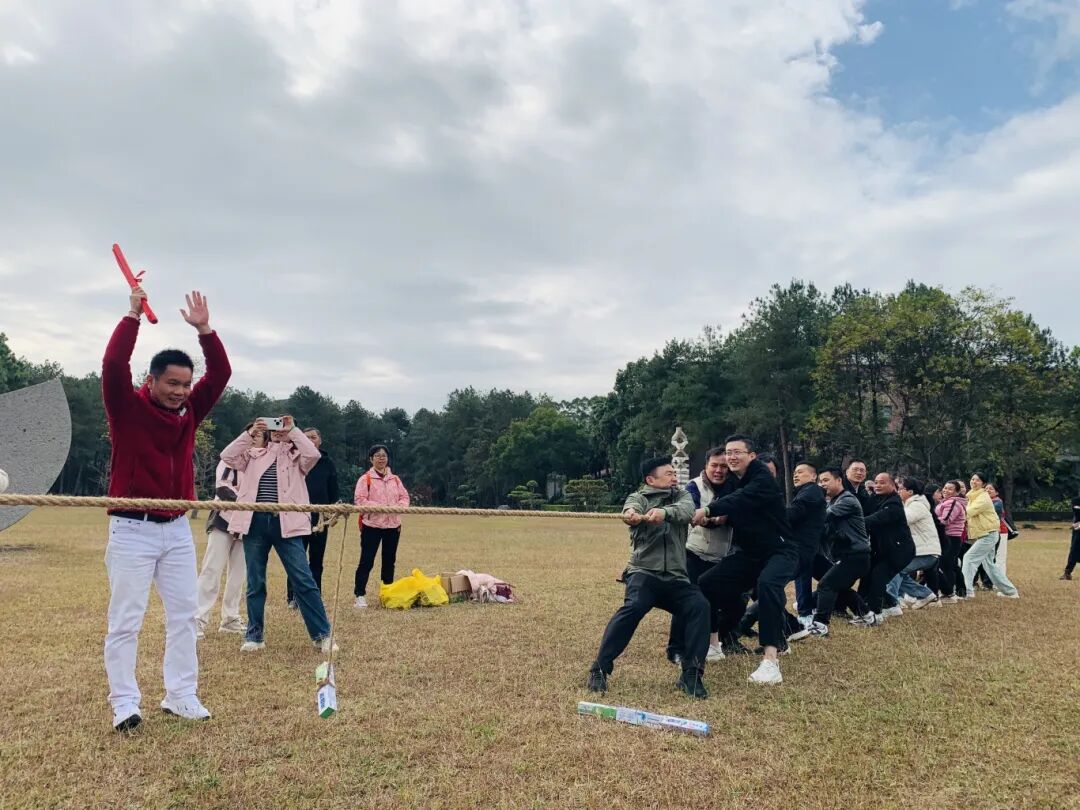 在工作人员的组织下,户外拓展活动开启。“拔河”比赛中,男女搭配自由组队,随着裁判一声哨响,双方卯足劲往后仰,周围的欢呼声、加油声此起彼伏,响彻园区。在“连环钻圈”项目中,三组队员各显神通,彼此助力,相互成就,集体的荣誉感和团队的凝聚力油然而生。拓展活动后,大家还自由体验了射箭、攀岩、高尔夫练习、健身舞等各类趣味运动,放松了心情,涵养了性情,增进了感情。