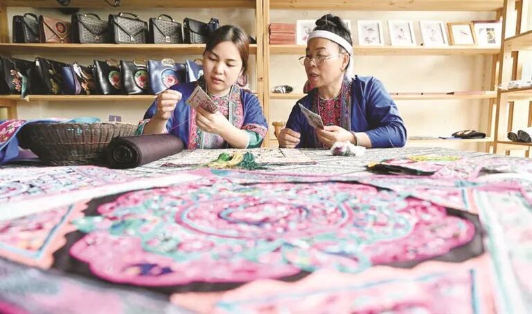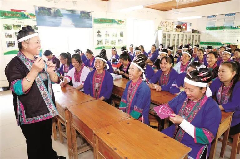 清花绣坊成为传承与创新侗绣技艺的平台。覃桂珍坚持用古法刺绣,让图案保持立体与精美。同时,她大胆地将侗绣纹样融入戒指、耳环、手镯等现代时尚饰品的设计和制作中,让古老技艺走进日常生活。母女俩还创立“企业+基地+传承人+绣娘”模式,培训3000余人次学习侗绣技艺,让留守妇女实现“守着家、抱着娃、绣着花、养着家。”