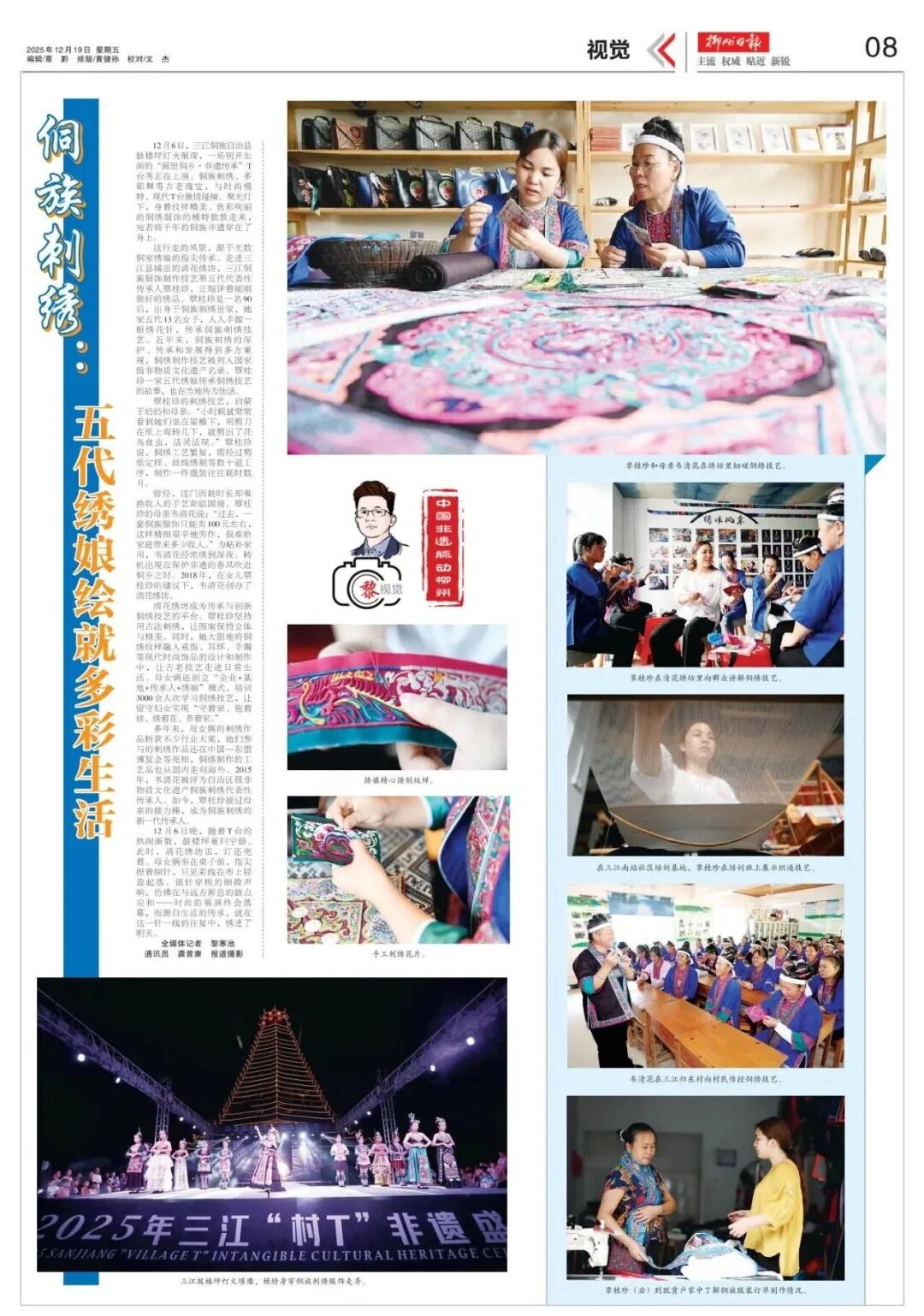 这行走的风景,源于无数侗家绣娘的指尖传承。走进三江县城里的清花绣坊,三江侗族服饰制作技艺第五代代表性传承人覃桂珍,正端详着刚刚做好的绣品。覃桂珍是一名90后,出身于侗族刺绣世家,她家五代13名女子,人人手握一根绣花针,传承侗族刺绣技艺。近年来,侗族刺绣的保护、传承和发展得到多方重视,侗绣制作技艺被列入国家级非物质文化遗产名录。覃桂珍一家五代绣娘传承侗绣技艺的故事,也在当地传为佳话。