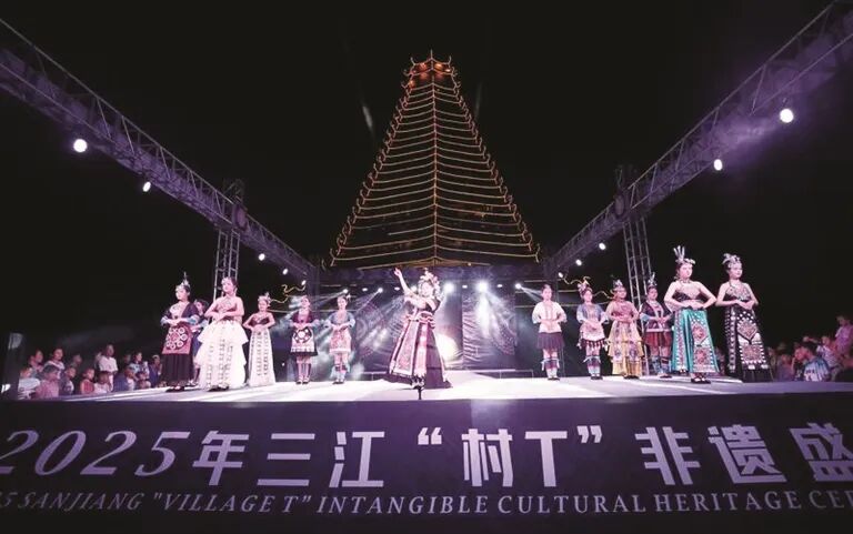 12月6日,三江侗族自治县鼓楼坪灯火璀璨,一场别开生面的“画里侗乡·非遗传承”T台秀正在上演。侗族刺绣、多耶舞等古老瑰宝,与时尚模特、现代T台激情碰撞。聚光灯下,身着纹样精美、色彩绚丽的侗绣服饰的模特款款走来,宛若将千年的侗族非遗穿在了身上。