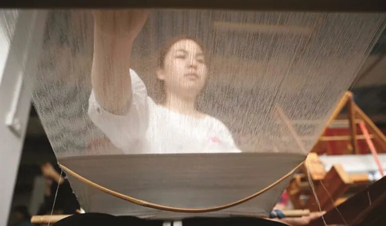 在培训班上展示织造技艺