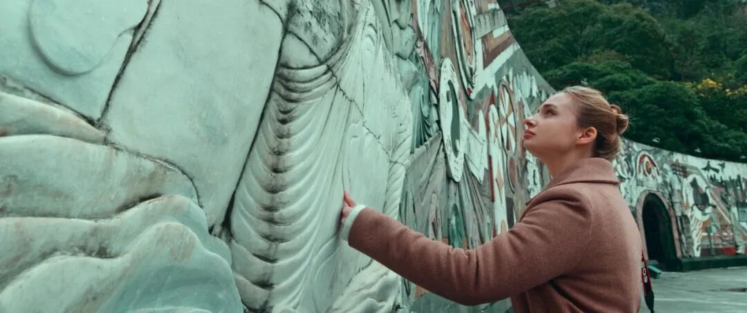 在七星景区“华夏之光”广场,她轻轻抚摸石刻墙壁,仿佛在与千年的历史对话。金色发丝与古老石壁形成鲜明对比,这一刻,时光似乎静止了。