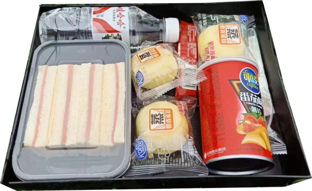 菜品:三明治(火腿,芝士,方包)、瓶装水、可比克薯片、小包番茄酱、巧克力、港荣蒸蛋糕