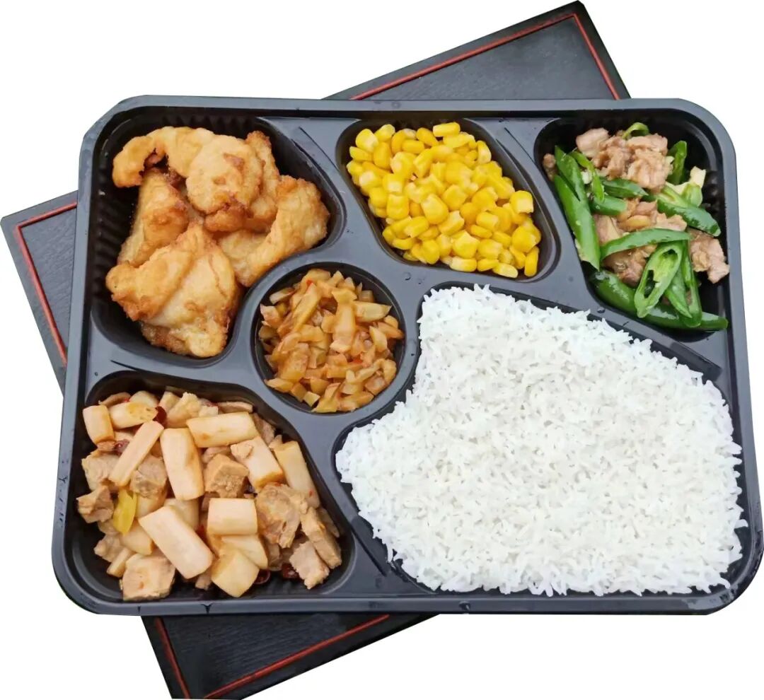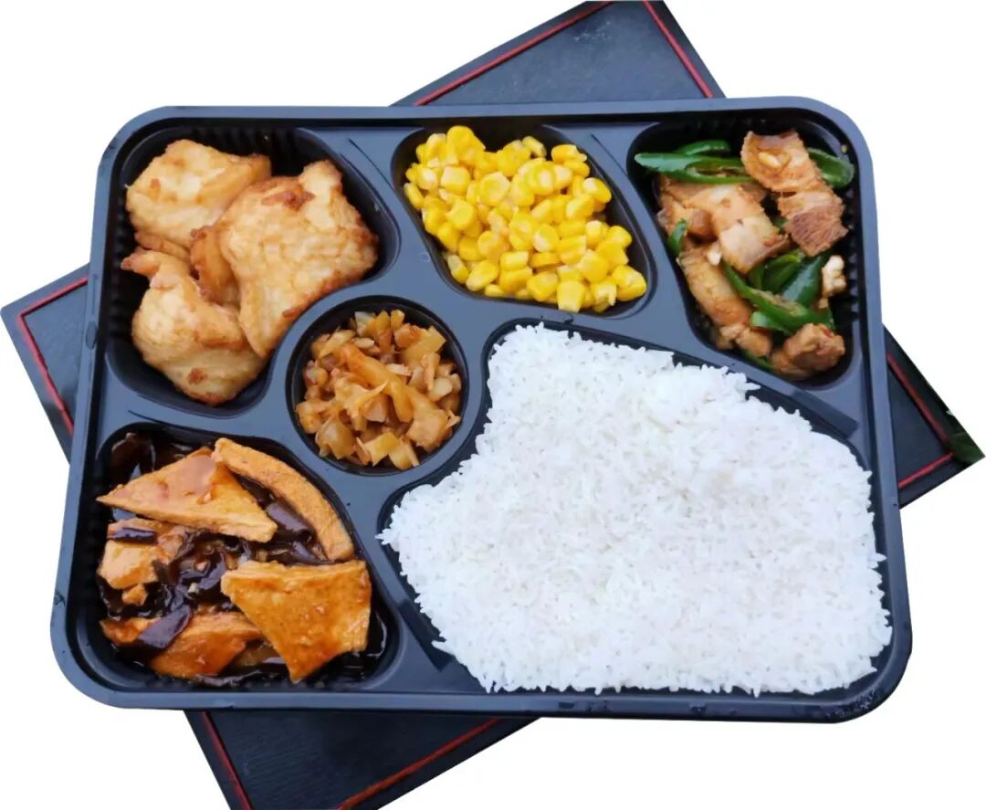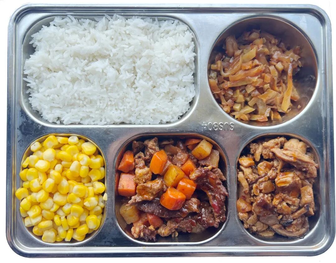 菜品:米饭、秘制牛腩、芋头蒸鸡、水果玉米粒、增味小菜