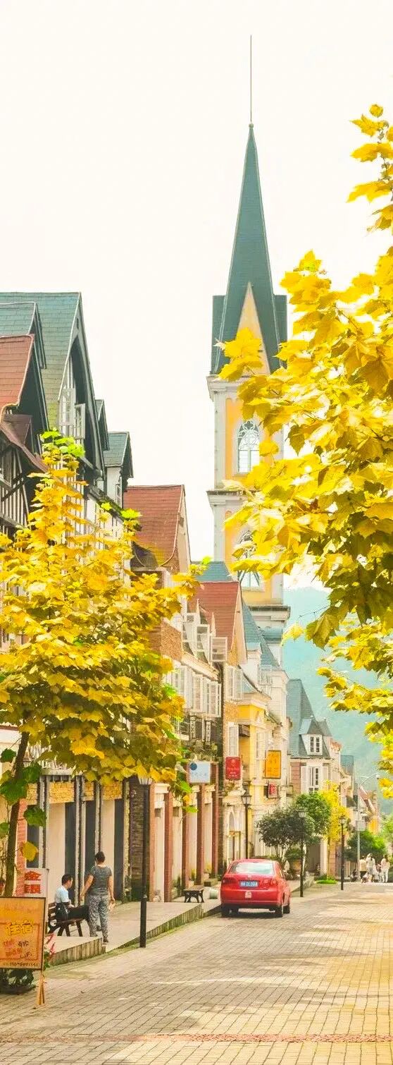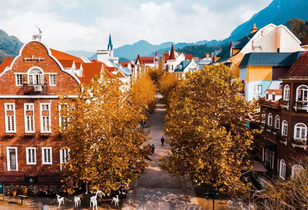 冬日白鹿,鳞次栉比的法式建筑点缀于青山绿水之间,色彩斑斓。阳光透过叶的缝隙,闪耀着它的光芒,将本已变黄的树叶染上一层金色,把林间的音乐童话小镇裹上温暖。