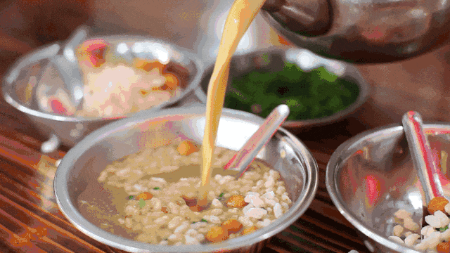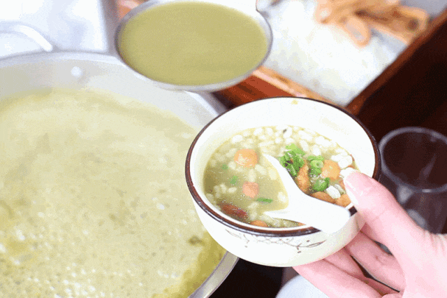 清晨,当第一缕阳光穿透薄雾,洒在碧波荡漾的桂江之上,平乐的水上油茶便在这宁静的氛围中缓缓拉开序幕,将姜、葱、蒜剁碎随花生、茶叶一起放入舂碓舂碎投入热锅中反复翻炒出辛辣之气,再加以沸水冲刷大火焖烧数分钟后用滤筛缓缓滤出柔腻金汤,这馥郁袭人的油茶,才算完成!