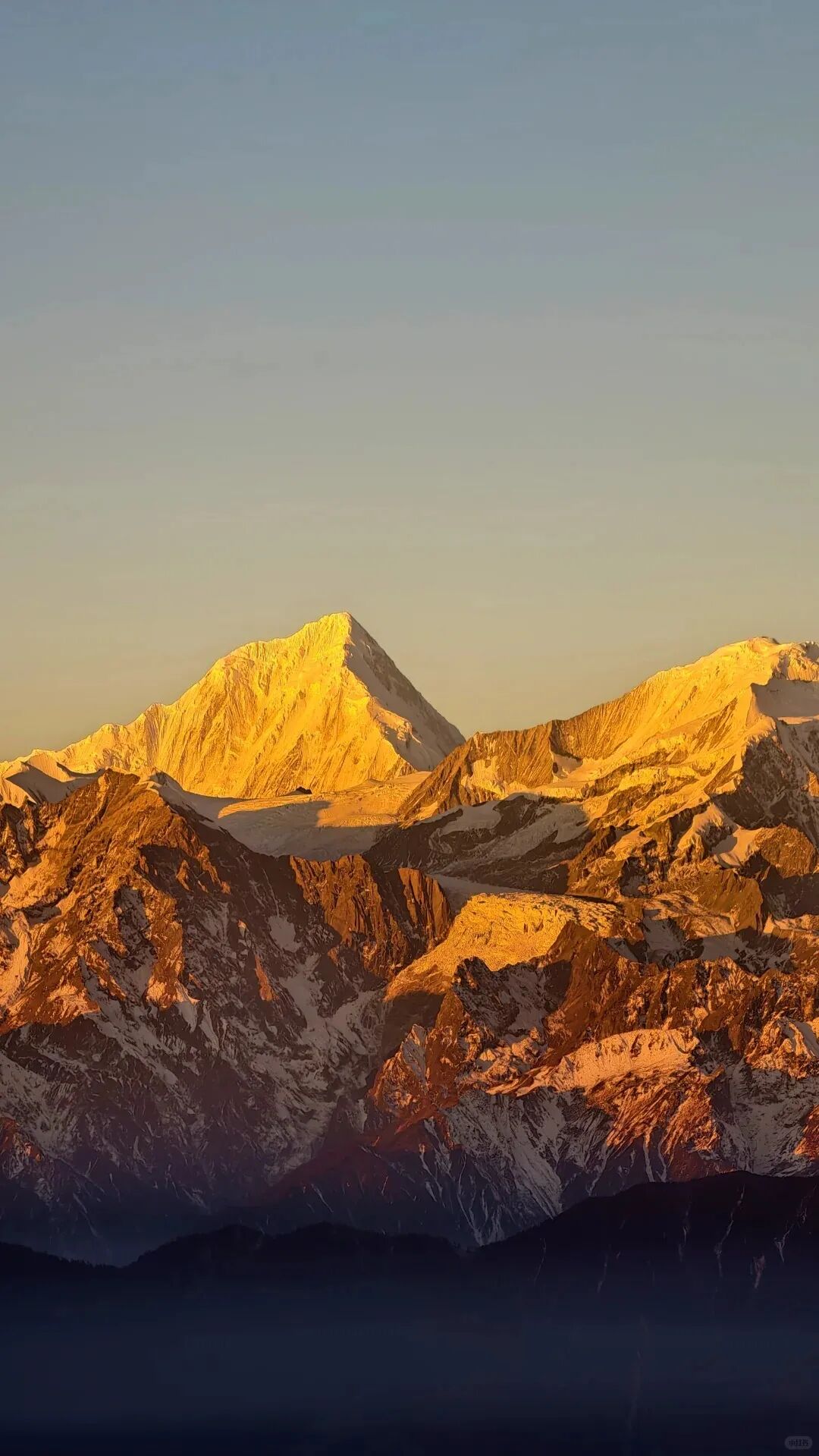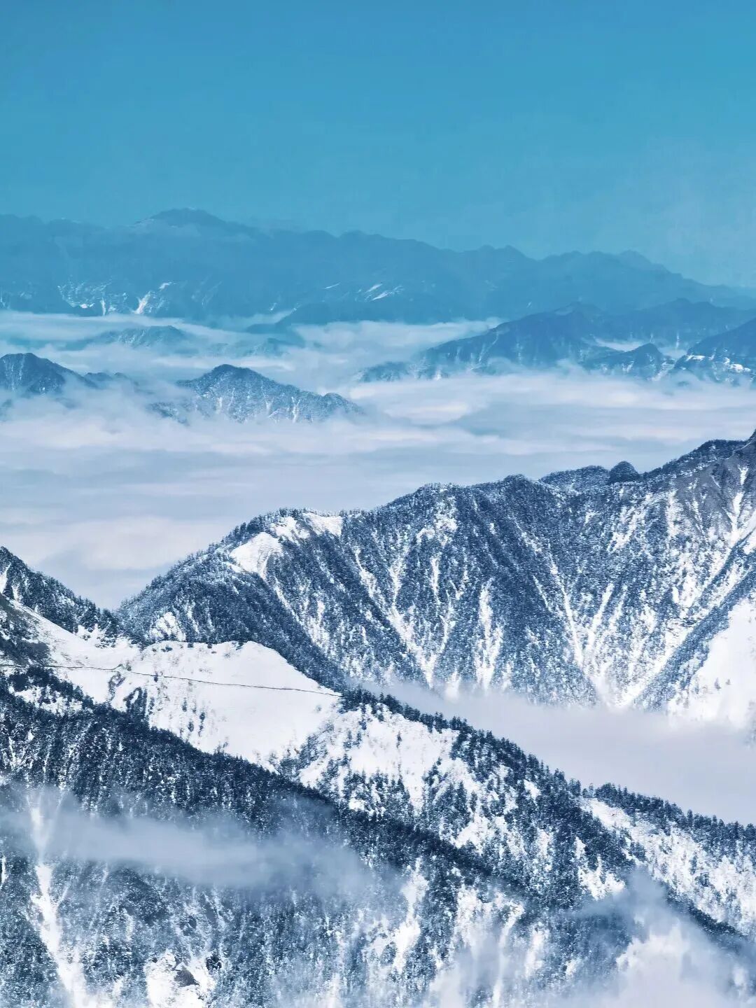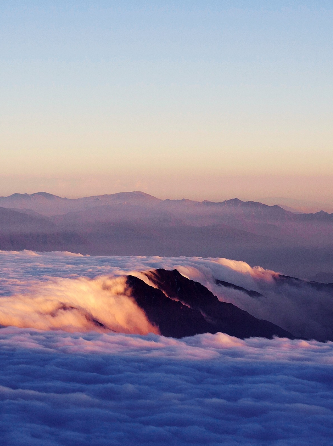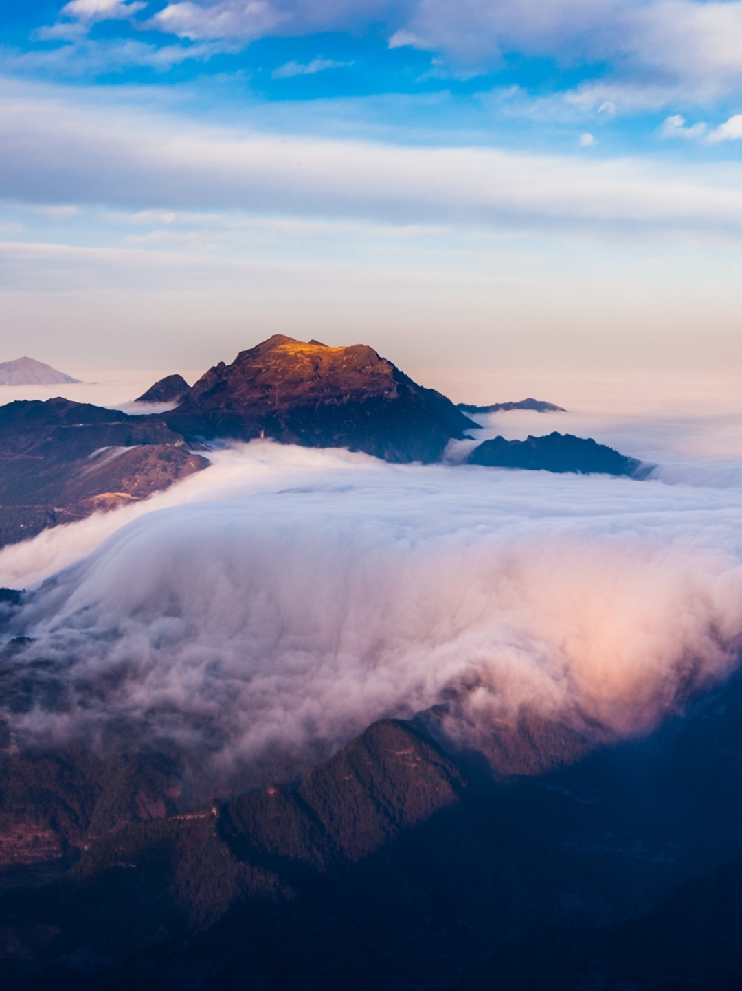 磅礴的云海如瀑布般倾泻而下,常常呈现出“云海漫金山”的奇景;日出时分,金色的霞光染红连绵的雪峰;夕阳西下,晚霞又将云海染成瑰丽的彩色画卷,美不胜收……
