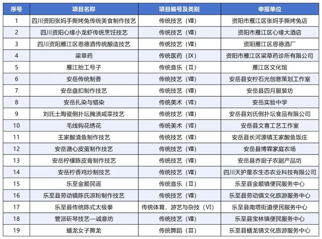 资阳市第七批非物质文化遗产代表性项目名录(共19项)已经市政府同意,现予公布。各地各部门要按照《中华人民共和国非物质文化遗产法》《四川省非物质文化遗产条例》等法律法规要求,认真贯彻“保护为主、抢救第一、合理利用、传承发展”的工作方针,坚持科学保护理念,扎实做好非物质文化遗产系统性保护与传承,推动中华优秀传统文化创造性转化、创新性发展,促进全市非物质文化遗产的保护传承和发展利用。