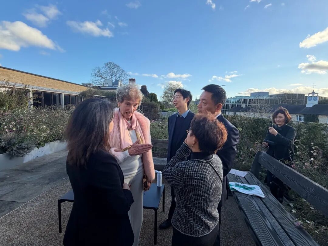 牛津大学终身荣誉教授唐纳·科特兹在展厅外花园与中方领导、专家和学者交流