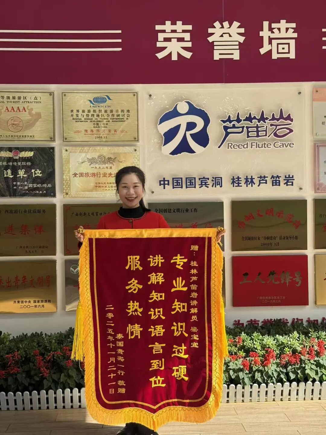 十年来,梁宝仪始终深耕一线讲解岗位,不断提升服务的专业性与贴心度,这面锦旗正是对她长期用心付出的最好回馈,也是芦笛景区 “国宾级服务” 理念的生动体现。