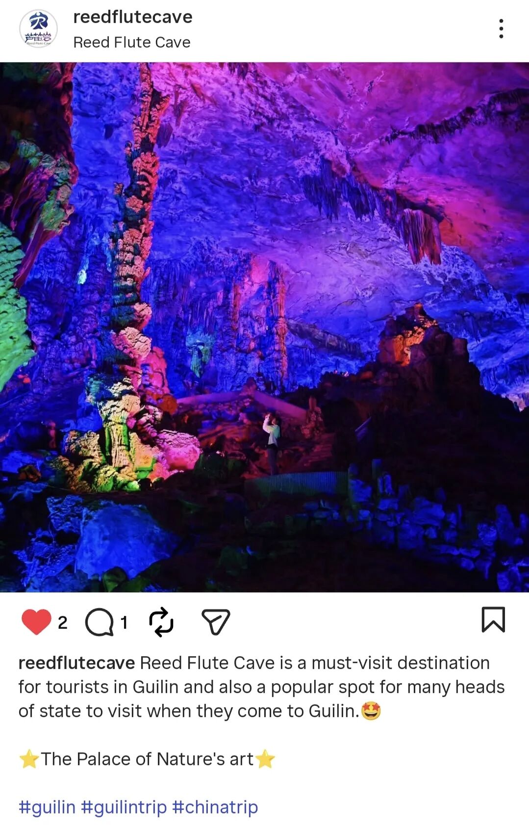 景区海外官方账号以多样化内容为核心竞争力,一方面通过原生态的美景照片,直观展现芦笛岩作为“世界国宾洞”的震撼景致,还原尼克松夫人盛赞的“宫殿级景观”;另一方面,用图文故事解读溶洞背后的文化底蕴,从唐贞元八年的壁书题刻,到导游服务中的暖心瞬间,让海外网友不仅看见山水之美,更读懂背后的人文故事。