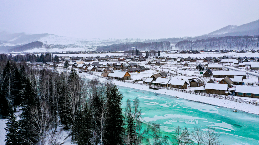 漫步湖边看冰封喀纳斯湖水的纯净与静谧。深冬化作蓝冰秘境,雾气在湖面流淌,安静得能听见雪落松枝的声音。