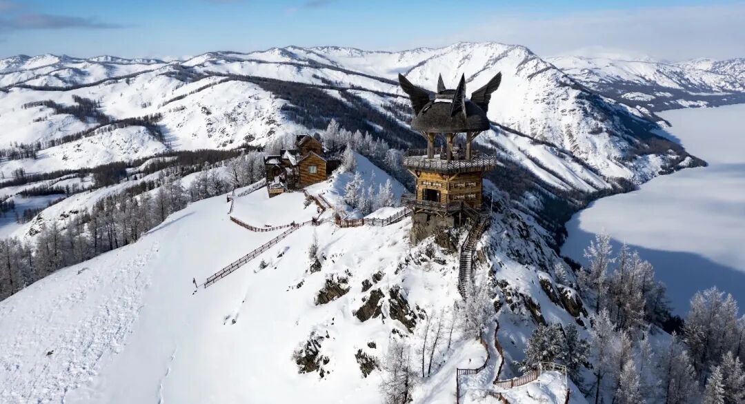 是俯瞰喀纳斯湖全景绝佳位置,登顶俯瞰,雪岭环抱中的湖面如一块巨大的白玉,晨光将云雾染成金粉色,仿佛置身云端之境。