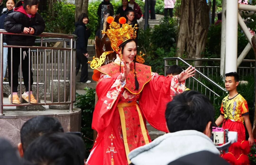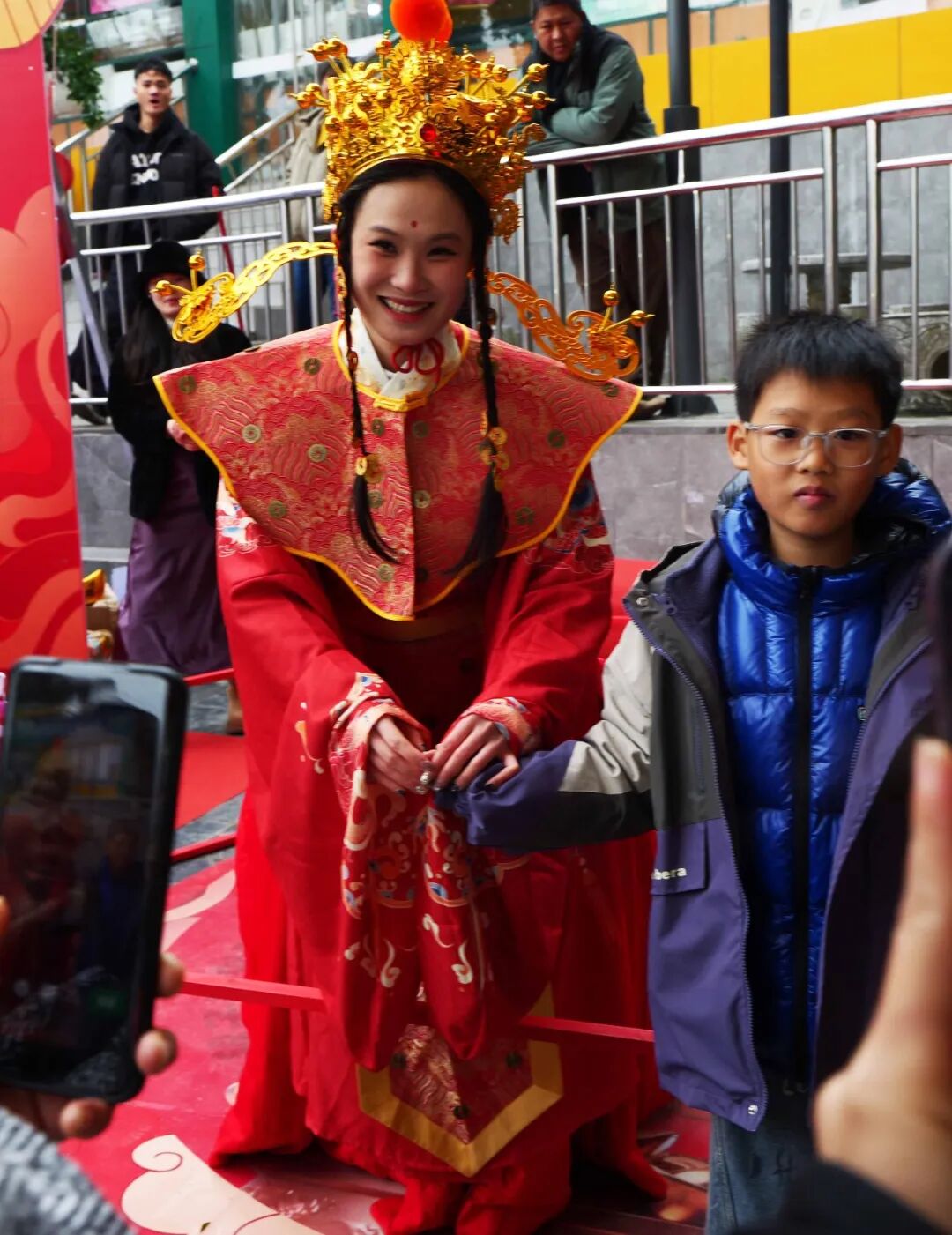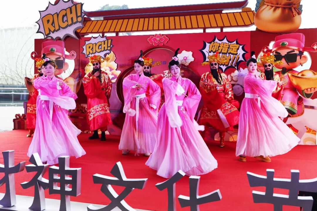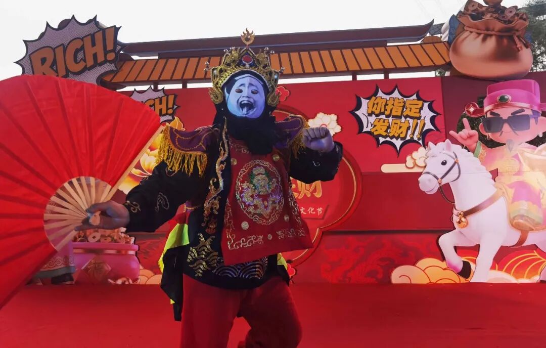 除了经典舞狮,景区内的财神主题演艺更是精彩纷呈。财神快闪秀惊喜现身,国潮风格的财神们伴着动感音乐活力起舞,打破传统民俗的刻板印象,让年轻游客直呼“太潮了”;财神送福大巡游中,五路财神携散财仙女沿街派送福卡、小礼品,所到之处皆是欢声笑语,沉浸式传递新春祝福;财神不倒翁表演更是人气爆棚,身着财神服饰的不倒翁轻摇慢摆与游客亲切互动、合影留念,成为景区里的“网红打卡点”;百变财神秀则以京剧变脸为基础进行爆改升级,演员先是变出一系列表情包引得台下哄堂大笑,后变出威武的武财神让人肃然起敬。