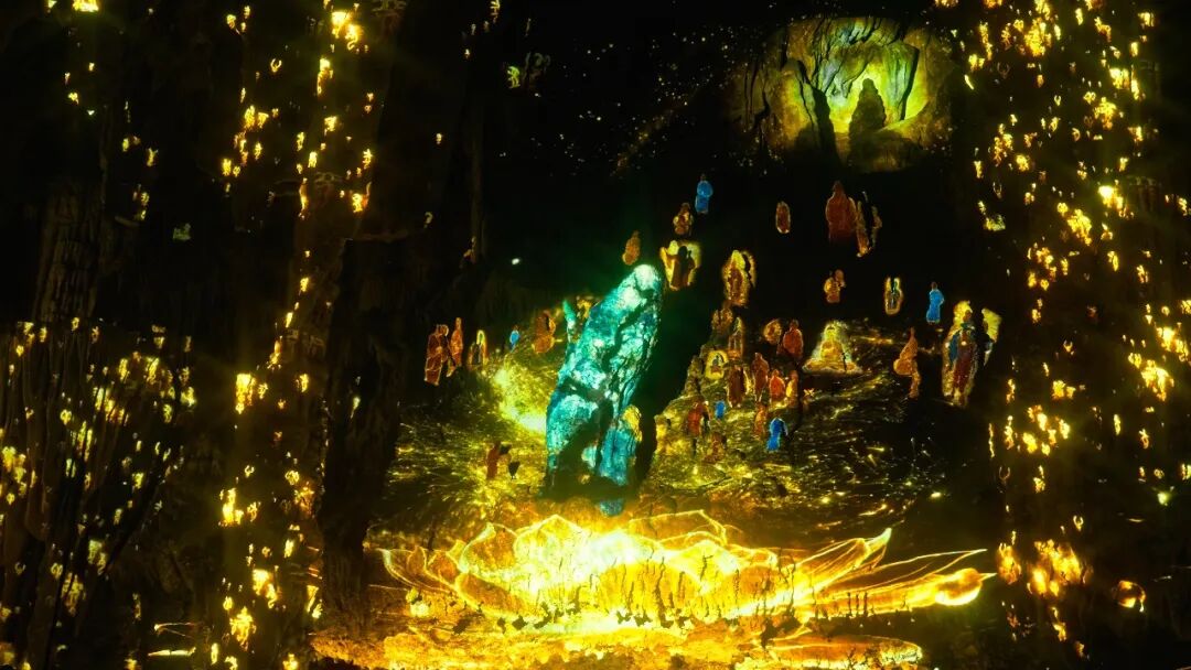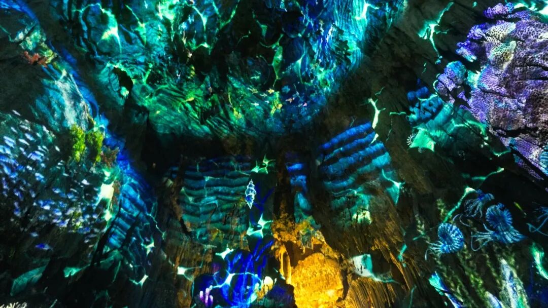 景区采用博物馆级控光技术还原地质素岩区钟乳石的原生肌理与银质光泽,解锁亿年溶洞的地质密码;瑰丽地貌区则运用3D MAPPING 技术,将国风美学与财神文化祥瑞符号映于洞壁穹顶,瑶池仙境的青绿意境在光影中徐徐展开,步步皆景、处处惊艳。国内首创的溶洞亲生物用光,营造出水纹波光、萤火星空的舒缓氛围,无接触交互+AR玩法更让游览趣味升级,让传统祈福化作可感的新春仪式。
