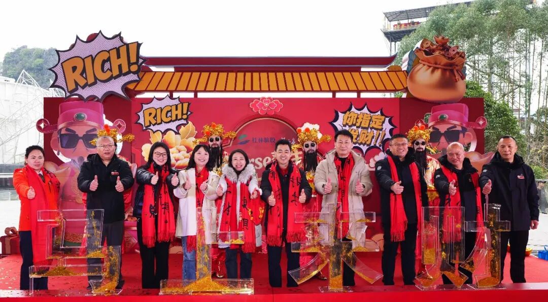 上午10时许,财神文化节启动仪式正式拉开帷幕。在热烈的开场舞后,桂林旅游股份有限公司总裁文政先生登台宣布银子岩第三届财神文化节开幕,现场鼓锣齐鸣、掌声雷动,年味瞬间拉满。