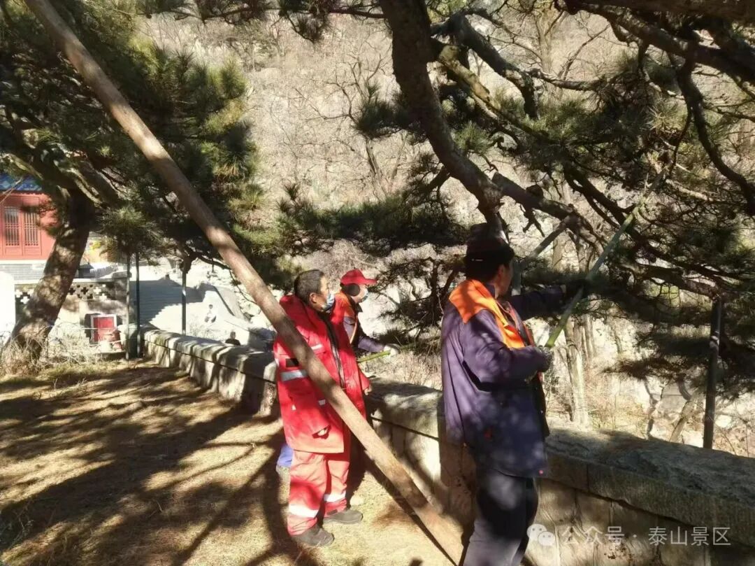 近日,中天门管理区根据季节变化,迅速行动,对辖区内重点保护古树名木强化管护措施,确保珍贵遗产资源安然过冬。