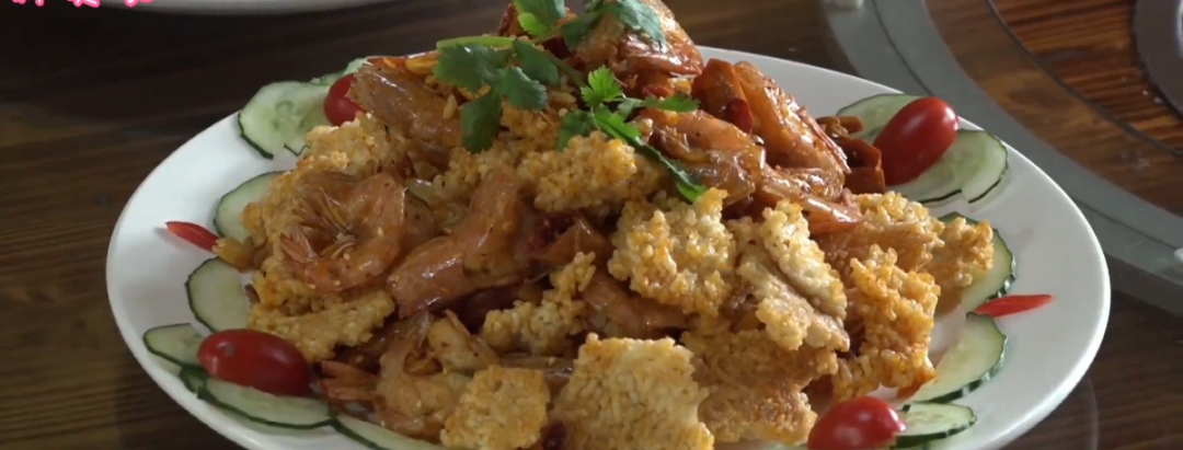 香樟园农庄的锅巴大虾、白灼脆雕鱼、农家稻香肉等特色美食。