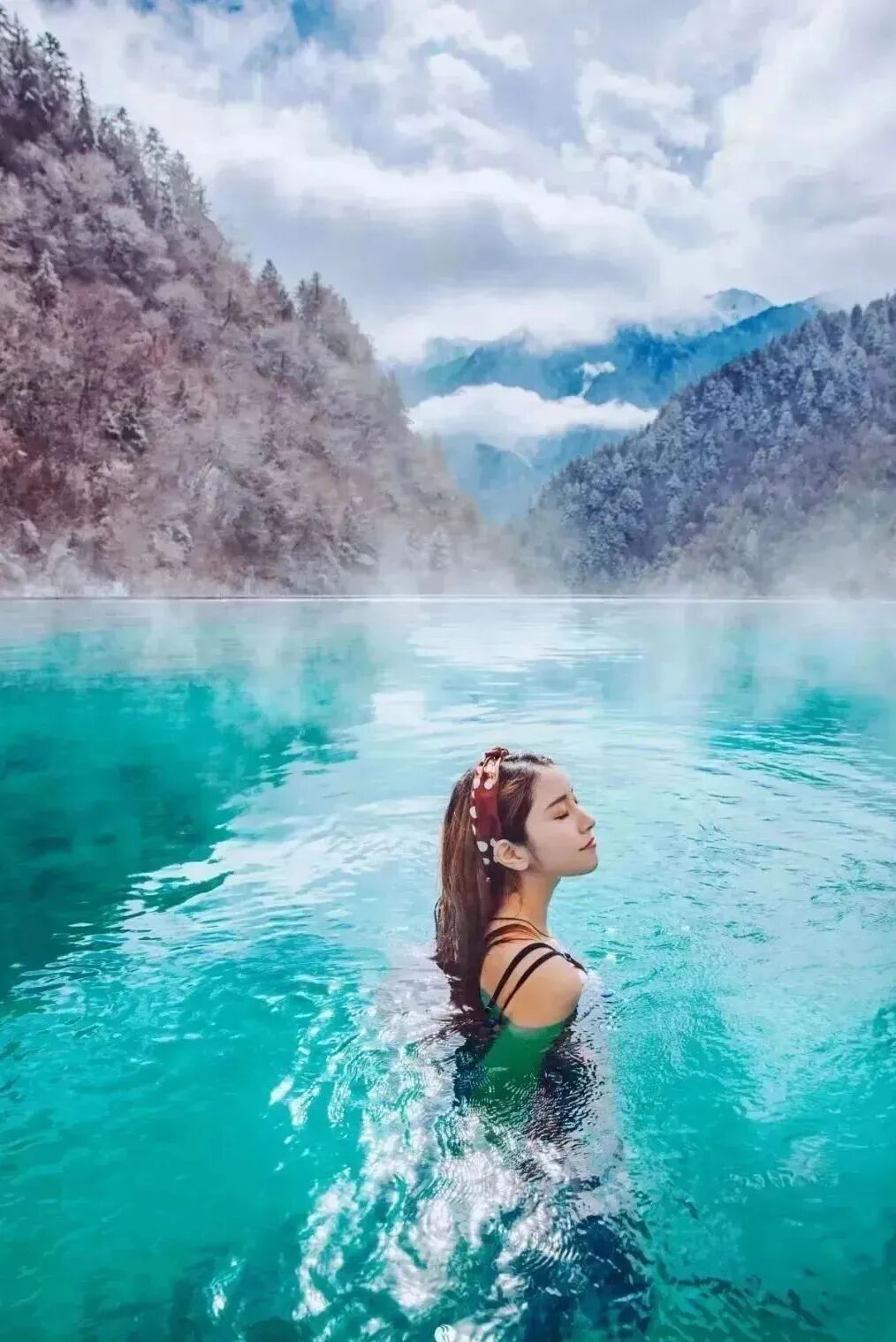 沐浴在温暖的汤池里,身后雪峰环绕,耳畔流水潺潺,任温润的泉水轻抚你的每一寸肌肤,让疲累抽丝剥茧而去~