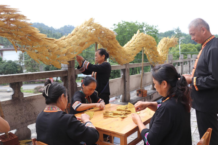 舞草龙是兰田瑶族乡数百年来的传统习俗,是“六月六”尝新节、盘王节等传统节日瑶族祭祀活动之一。清朝初年,瑶族先民开荒种地,遭遇虫灾,于是先民们想到龙是神灵的化身,它能呼风唤雨,镇邪降妖,便用毛竹、稻草等制作草龙,到盘王庙杀猪、宰鸡、宰鸭、打糍粑、包粽子,烧香拜神,抬着草龙遍舞田间地头。然后先民们把草龙送到溪水边烧掉,寓意化龙归海,把虫害、病痛也一并带走,祈求来年五谷丰登、全寨人无灾无病、幸福安康。
