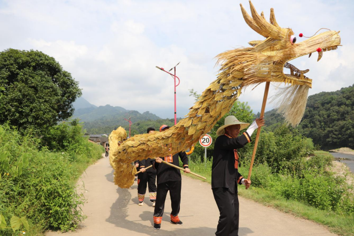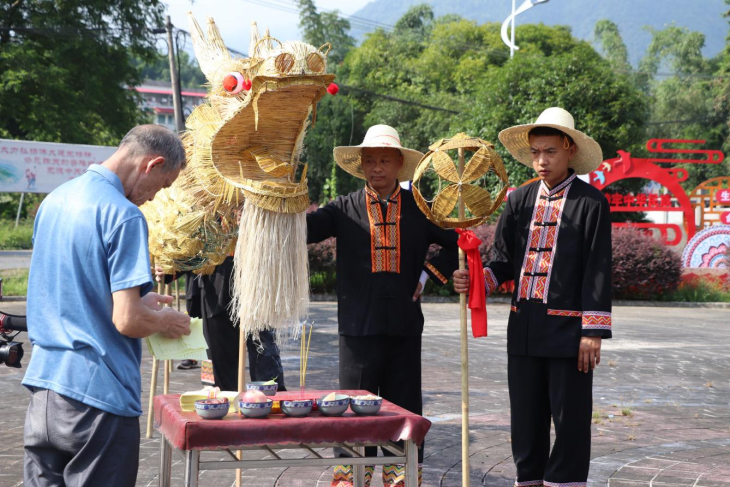 当地瑶民生活习俗、服饰、语言较完整地保留着瑶族传统,原始生态保存完好,并保留传统的劳作方式进行稻秧栽种,有较为浓厚的瑶文化氛围,故此瑶族传统习俗得以留存。舞草龙习俗目前主要是以集体传承、大众实践的方式代代相承。它融合了传统的舞龙技巧和特有的祭祀仪式,分三段程式进行。舞龙前,邀请师公为龙点睛开光,“祭神龙”、摆香案、焚香烛、敲锣、放炮,仪式隆重;舞龙时,舞龙者一般为训练有素的强壮男子,届时他们着瑶民盛装,两人持锣,两人持镲,一至两人敲鼓,在锣鼓伴奏下,一人舞龙珠前引,九人持九节龙身舞龙,按照传统程式在村道巷弄、田间地头穿梭舞耍,时而逶迤蛇行,时而上下翻腾、左右起伏, 充分展现“神龙”的精、妙、神、奇;舞龙后,人们将草龙抬至溪边烧掉,寓意化龙归海,把病痛、虫害也一并带走,从而达到消灾祈福、保苗增收的目的。
