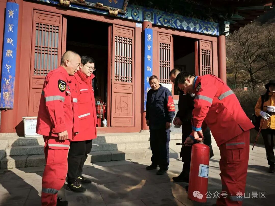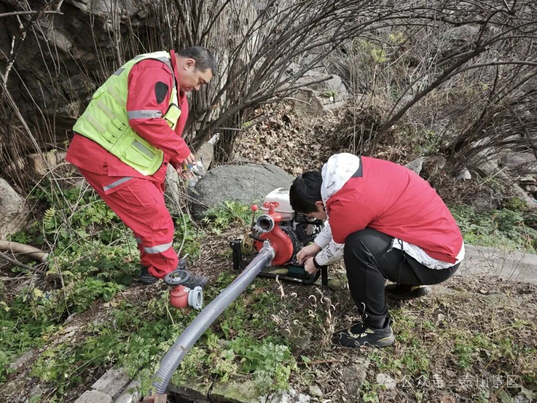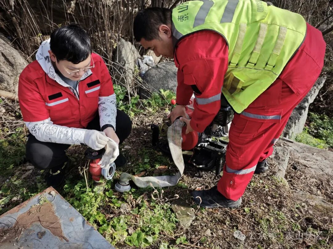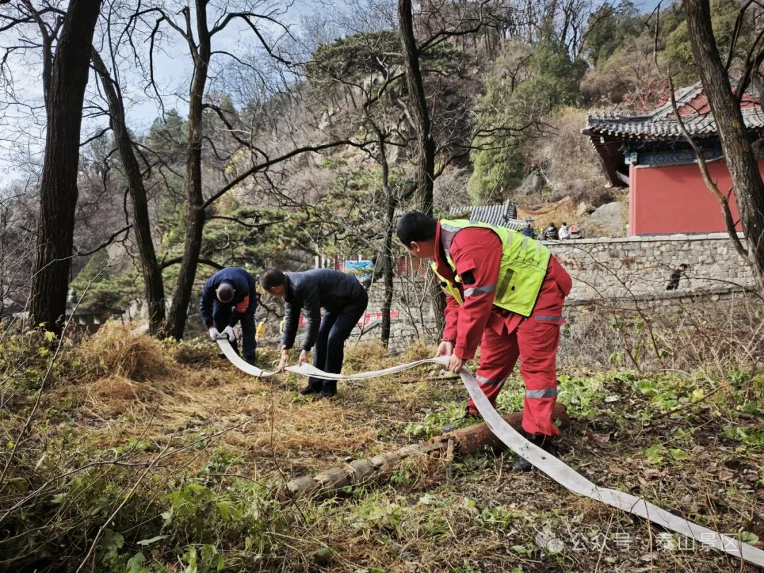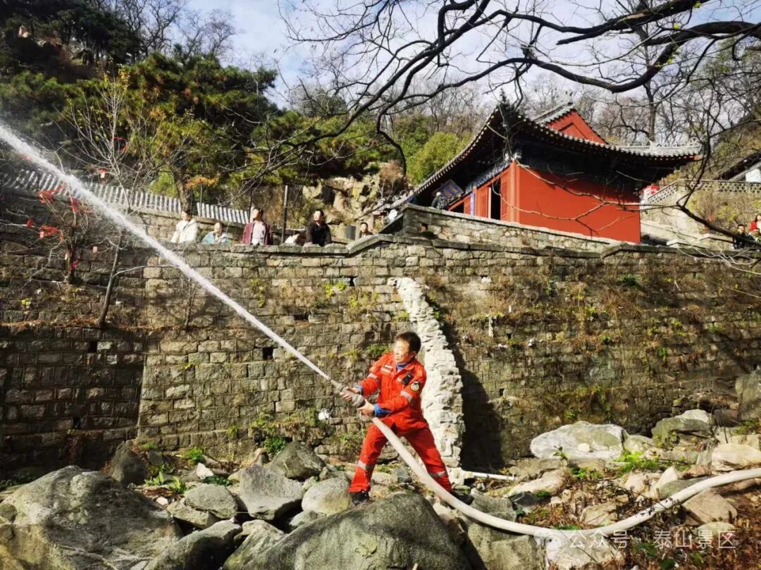 为保障文化遗产资源安全,提高古建筑突发事件应对能力,近日,中天门管理区联合国山旅游公司等驻山单位在五松亭开展古建筑消防安全演练,现场演练模拟五松亭院内古建筑出现“火情”,接到报警后,消防应急救援力量迅速赶赴现场展开扑救。紧急撤离、器械操作、扑救灭火,整个演练以迅速处置古建筑火情为前提,展开应急疏散及扑救,并模拟消防电泵断电情况下,紧急启动备用手抬机动泵等应急程序。