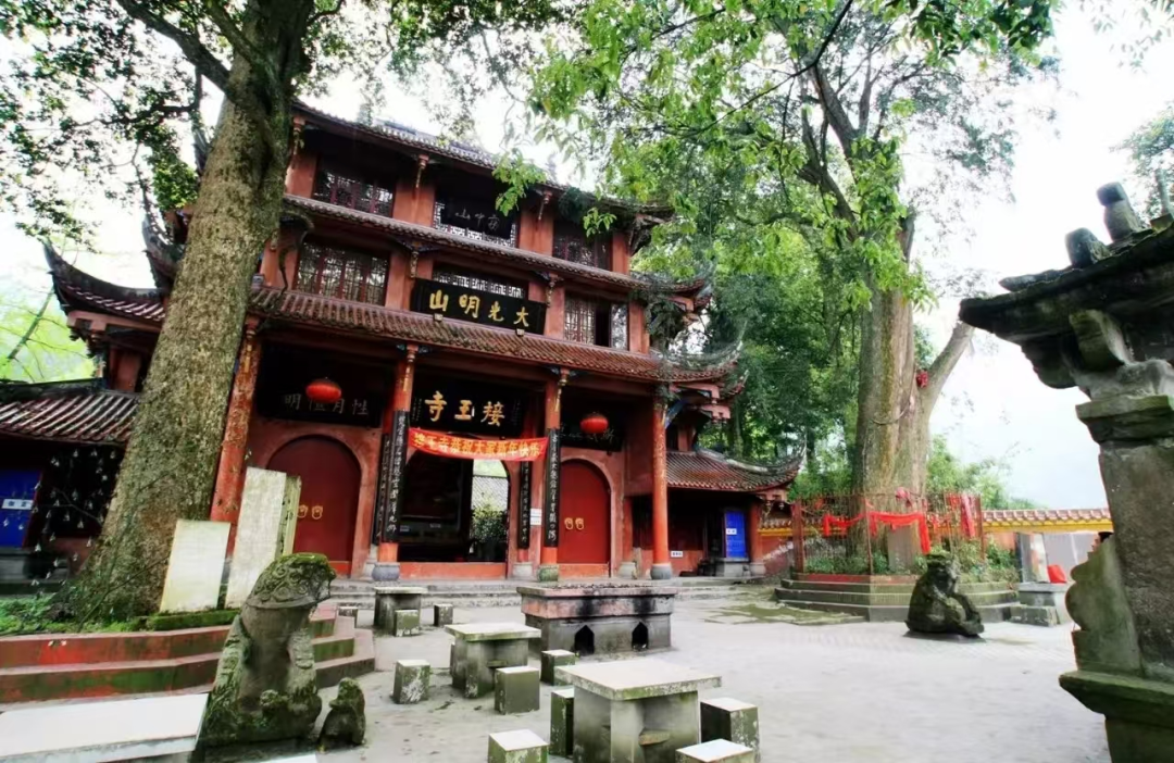 碧玉潭,在雾中山青霞嶂二百二十米处。宋文同《题雾中山碧玉潭》诗云:“千岩角逐互吞吐,一峰拔起矜崔嵬。日光微漏潭见底,水气上薄云成堆。”明范汝梓《游雾中山记》云:“岩北刻碧玉潭三字。因吟文与可千岩角逐互吞吐句,不觉拍手叫绝。”明王圻《游雾山记》云:“又里许,经石磴石岩左瀑,仅可置履,曰:此碧玉潭也。潭故冷然清,渊然深,颇难于步。嘉靖辛酉忽被风雷震塌。……自青霞至此,此其最佳。”《大邑县佛教志·艺文》卷十一《佛教圣地雾中山》也云:“碧玉潭与青霞嶂同为雾中山风景最佳处。岩北刻有‘碧玉潭’三字,因岁久没入荒土,后为县文管所发现掘出。字大径尺,笔力遒劲。碧玉潭为宋文同游此时题刻。”