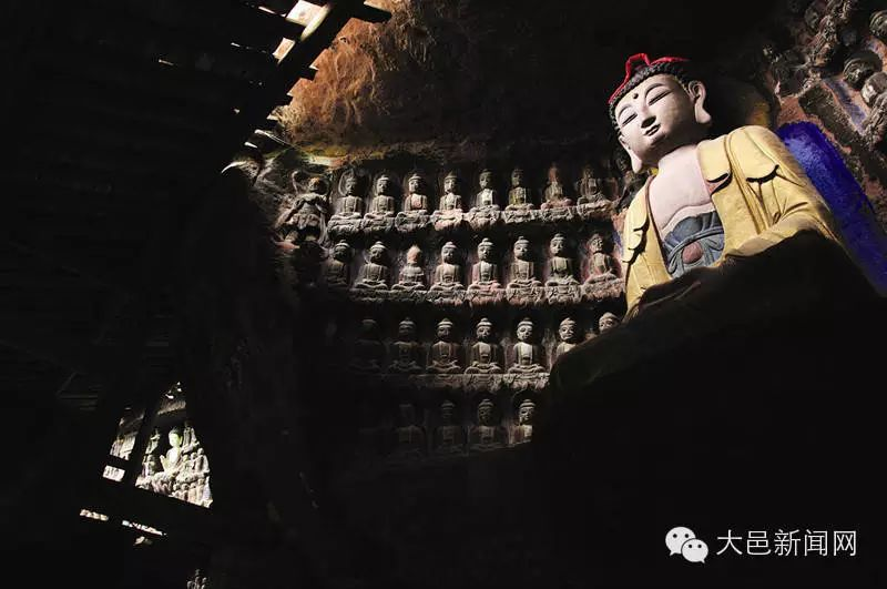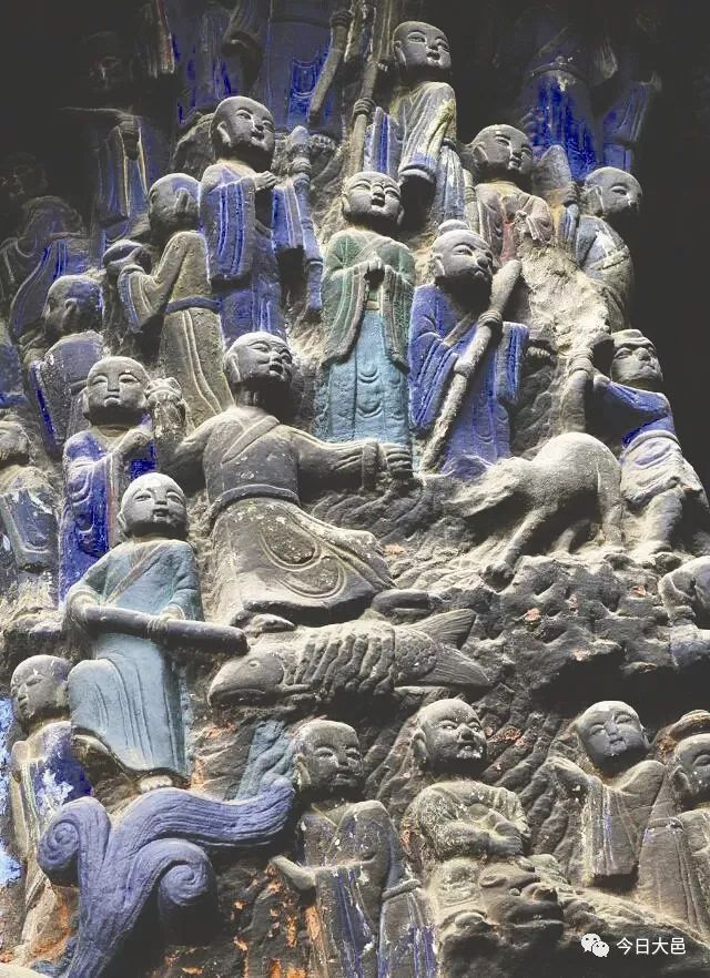 在佛教造像中,文殊与普贤两位菩萨为释迦牟尼的左右侍者。文殊是美妙之意,掌管着智慧,手持剑,代表着智慧的利刃能断除众生的一切烦恼,他骑着狮子,表示智慧和威猛无敌;普贤是理智、笃定、正行的化身,普贤菩萨的坐骑是白象,表示智慧忠诚和行事专一。无论两尊菩萨还是他们的坐骑,都镌刻得精美细腻、栩栩如生。在另一洞窟中,雕刻着神态各异的四大天王,四大天王是佛教二十诸天中的四位天神,分别是:东方持国天王,名叫多罗吒,管辖须弥山腰东;南方增长天王,名叫毗琉璃,管辖须弥山腰南;西方广目天王,名叫毗留博叉,管辖须弥山腰西;北方多闻天王,名叫毗沙门,管辖须弥山腰北。四大天王造像边,还雕刻着一尊镇水菩萨。