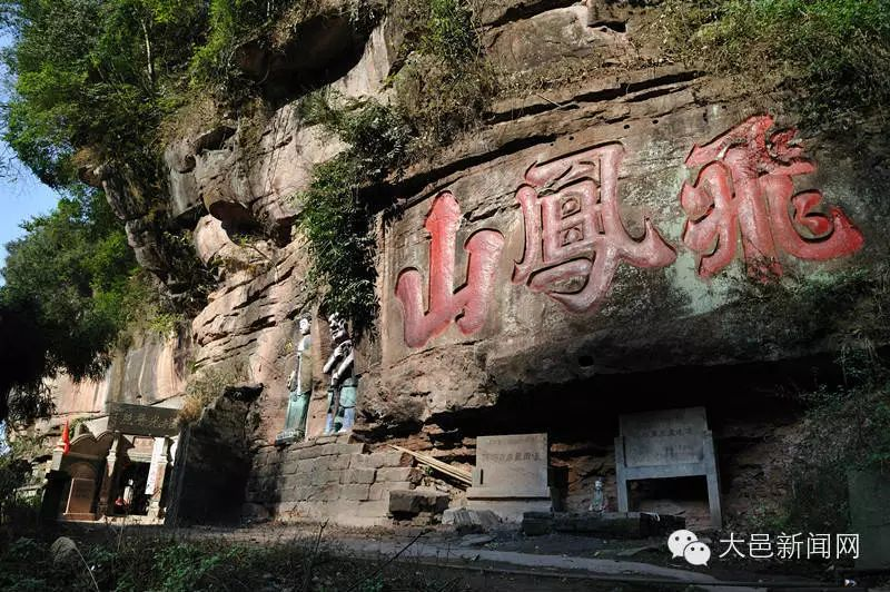 大邑县规模最大的佛教摩崖造像,是位于斜源镇磐石村飞凤山的药师岩摩崖造像。飞凤山距大邑县城21公里,山势奇绝。在胡田坝下车过铁素桥步行1公里,就到了飞凤山脚。沿着崎岖不平的山路攀登,到了半坡,首先映入眼帘的是镌刻于悬崖绝壁上的“飞凤山”三个雄壮浑厚的楷书题刻。相传此题刻者为清代翰林大学生伍嵩生。因为药师岩前临凤凰禅院,而整个山形又如一只展翅腾飞的凤凰,所以人称“飞凤山”。药师岩摩崖造像沿着飞凤山山腰开凿。古人在长150米、高200米的崖壁上,开各类造像1032尊。其造像可分为佛像、菩萨像、罗汉像、弟子像和众生像等五个等级。