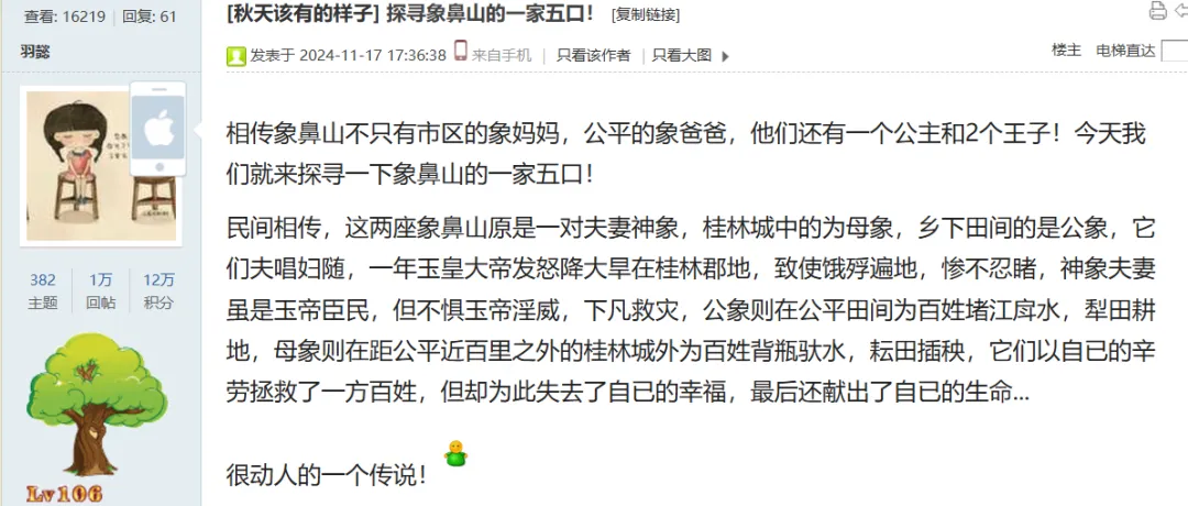 一则“探寻象鼻山一家五口”的帖文