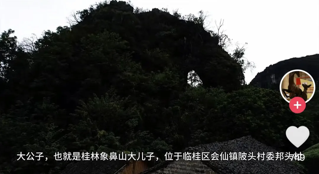 另一个“大象公子”在阳朔金宝乡的延村村委上延村往北约100米处,位于近百米高的山顶,周围是悬崖峭壁。从远处看,这座“象鼻山”个子较高,形象眉清目秀。