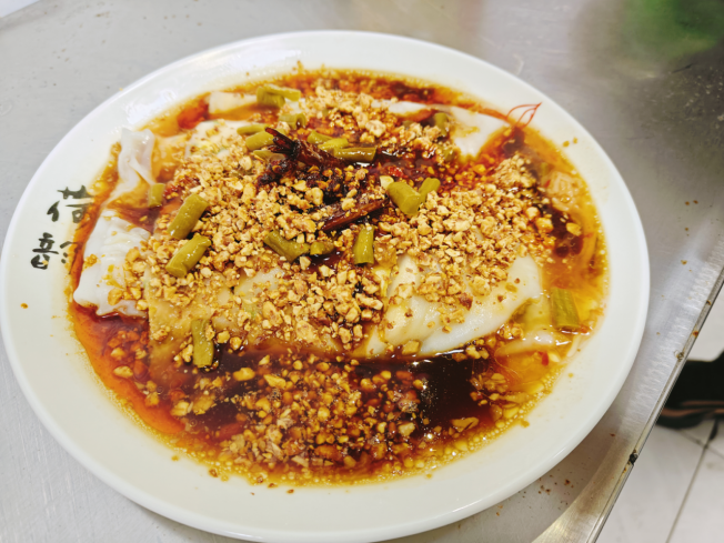 店名点题,一家专卖肠粉的小店。肠粉粉皮软糯而有弹性,里面包裹着有鲜嫩的肉末、爽脆的木耳等。肠粉一装盘,浇上秘制酱汁,再根据个人口味添加各种小配菜和酱料,一口下去,就在舌尖上舞动出一场层次丰富的美味盛宴。