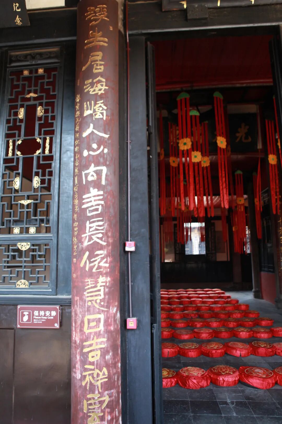 上联意为:大雄宝殿辉煌肃穆,可想像佛陀讲经说法、天空中的曼陀罗花像雨一般飘洒下来的情景。人们也没有辜负宝光寺这处佛境圣地。