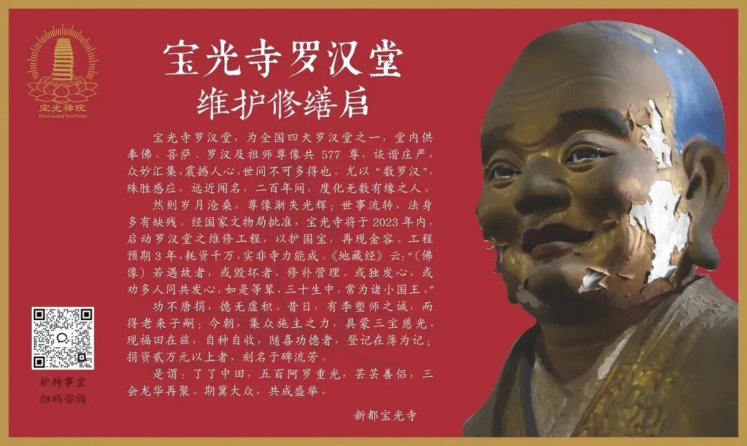 此联刻挂于大雄殿邻间檐柱上。上款署“新都宝光禅院大雄宝殿”,下款署“胜齐撰文,蒋超献联,乙未夏月,何应辉书于西蜀锦里”。此联为胜齐代美国洛杉矶美籍华人蒋超所作。乙未夏月,即2015年夏天。