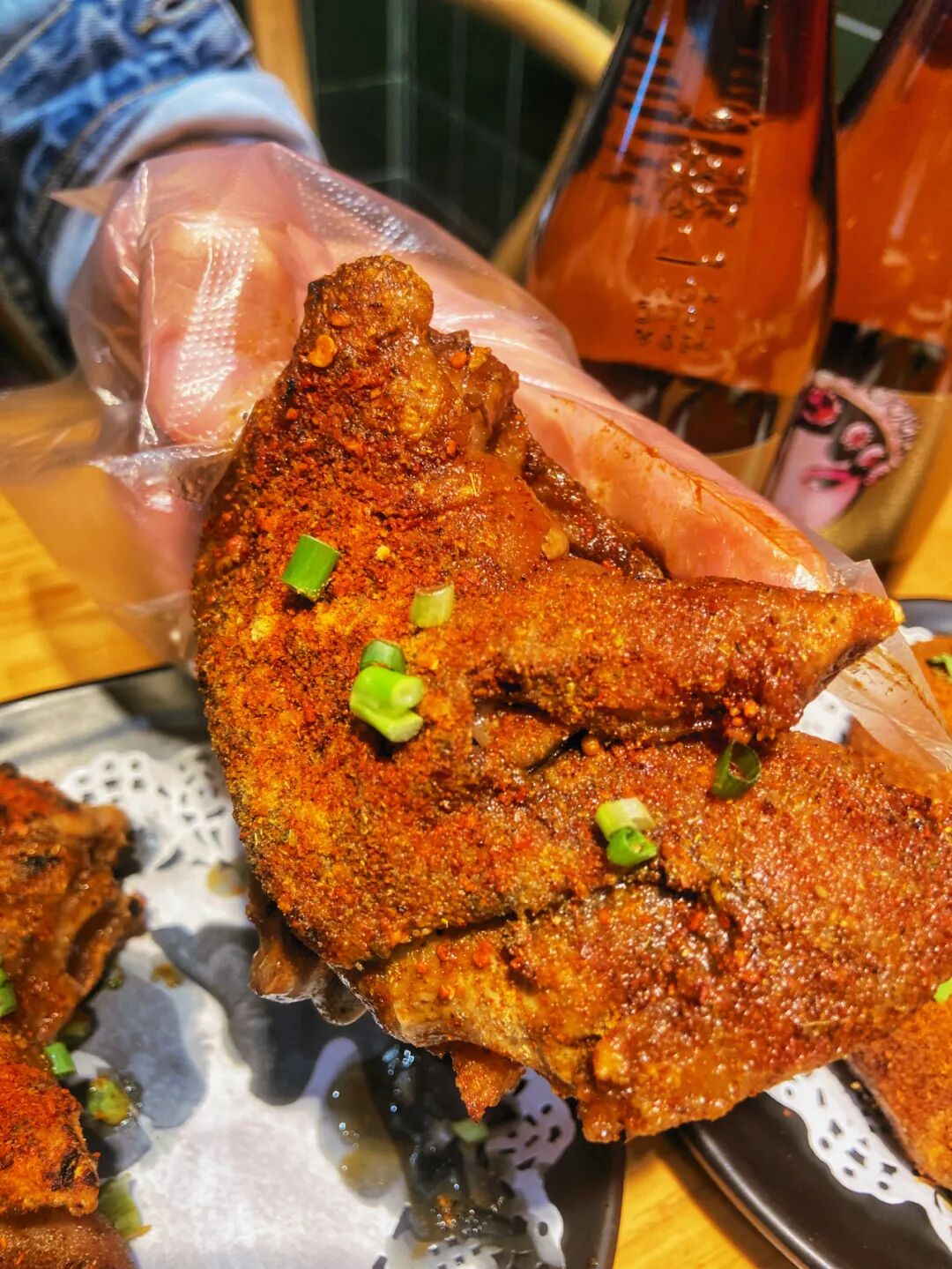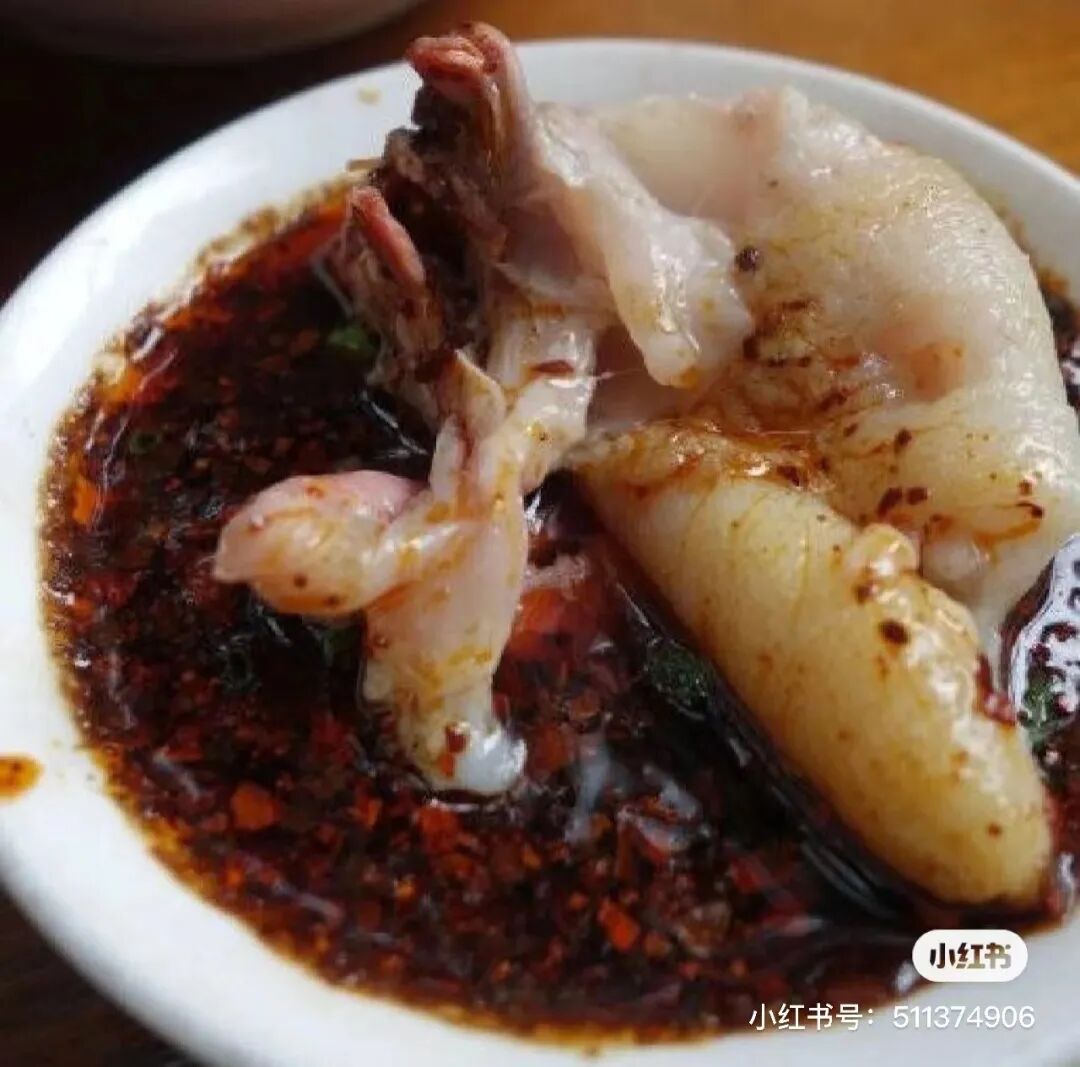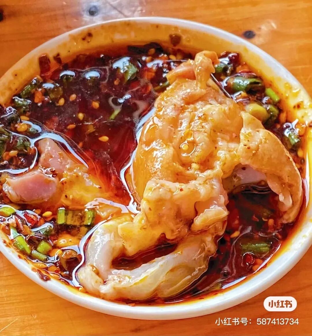 将其在秘制红油蘸碟里滚一圈