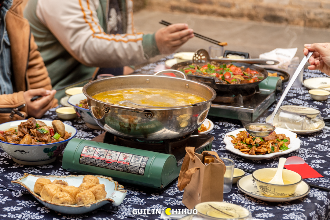 石墙青瓦,古木参天,小桥流水,走进村落,一股淳朴的气息便扑面而来。微风吹过,带着片片落叶纷飞,江边的宁静村落,便会荡漾起诗一般的涟漪。村如其名,山水与建筑形成一幅绝美画卷。东漓古村还原了典型的桂北传统古民居村落风貌,每到深秋,乌桕变红,丝丝薄雾飘在黑白民居之上,让人觉得恍如隔世。舂粑粑之欢愉、飞锤榨油之震撼、石磨豆浆之醇香、扯腐竹之技艺……这些罕见的民间手艺,在东漓古村中代代相传,生生不息,诉说着古老而动人的故事。长桌宴原是桂北过年或宴请的庆祝方式,也是最隆重的待客礼仪。一家人请客,摆一张长桌宴,一族人请客,摆一排长桌宴,像接龙似的。桌子越长,场面越是热闹壮观,浓浓的人情味也就出来了。