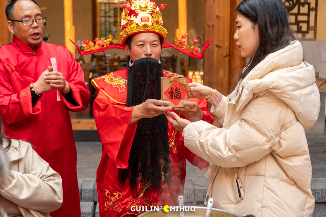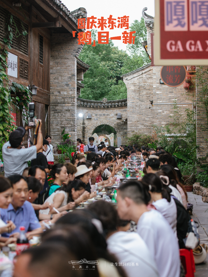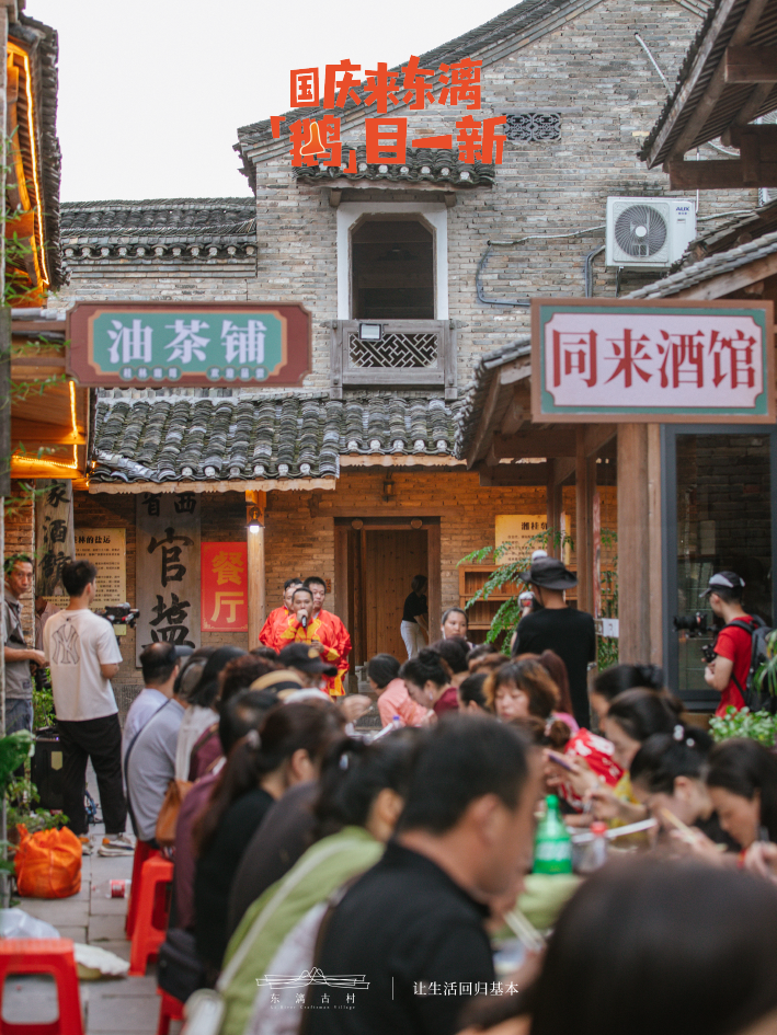 长桌宴上的菜品都是古村自产自销,散养的土鸡土鸭、无添加的腐竹、村民自种的青菜......长桌宴上,还有特色的小活动“财神送财”、“敬酒歌”,聚餐的氛围感也在此刻拉满,来自五湖四海的客人们,顿时也没了距离,吃着、聊着、互相斟上香喷喷的米酒,过足饕餮之瘾。
