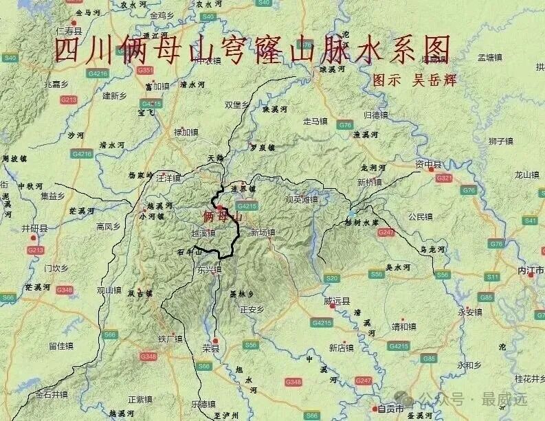 兴隆场大峡谷尾端 “压尽陵州百万峰,岿然两母在云中”。俩母山海拔835米,两峰并立,南大北小,形似母女,相依相偎,秀丽婀娜。俩母山主山脉呈“∽”形,横置东西,走向南北,是威远清溪河、越溪河,荣县旭水河、中溪河及周边13条河流的发源地。