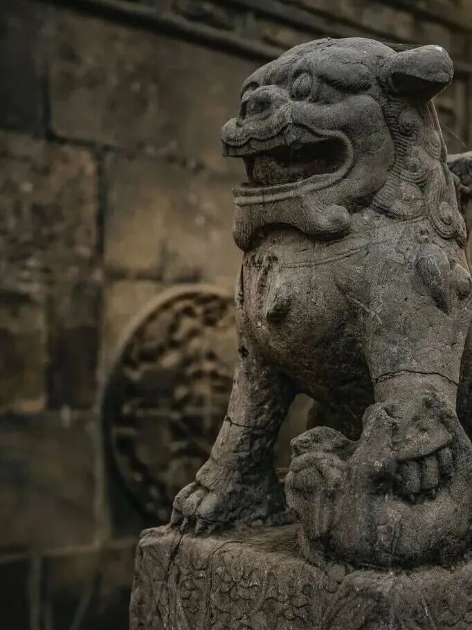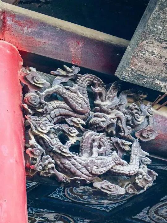 面朝东方的砖石山门,是探寻吕祖庙的开始。步入其中,首先映入眼帘的是正中硕大的牡丹浮雕,与两侧精美传神的二龙戏珠石刻相映成趣。穿过卷棚,拾级而上,便抵达幽静的前殿。
