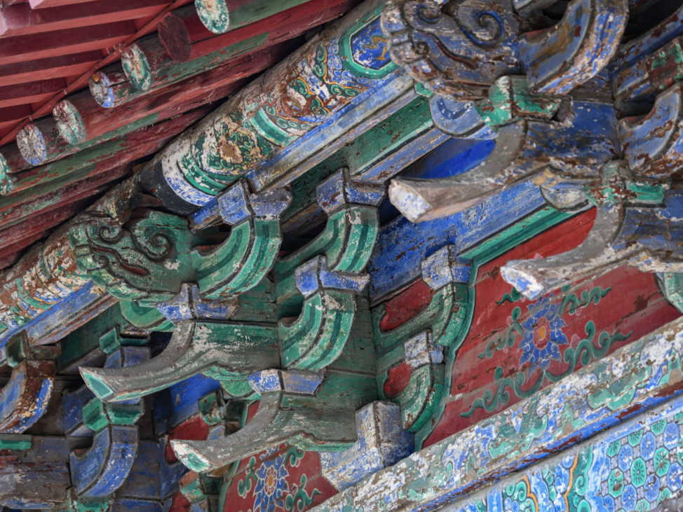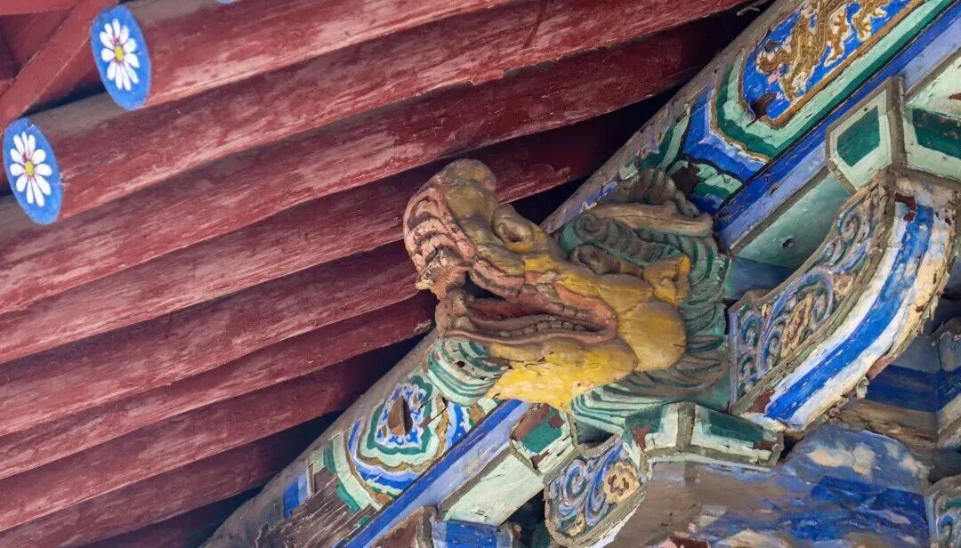 定鼎堂为庙中年代最久、结构最精的建筑。其采用纯木榫卯构造,未用一钉,梁架为抬梁式,留有辽金遗风,坚固非常。正脊石刻雕花尤为精美,正面为“双龙戏珠”,背面饰“凤舞牡丹”,以带状图案反复延展,尽显传统艺术之美。