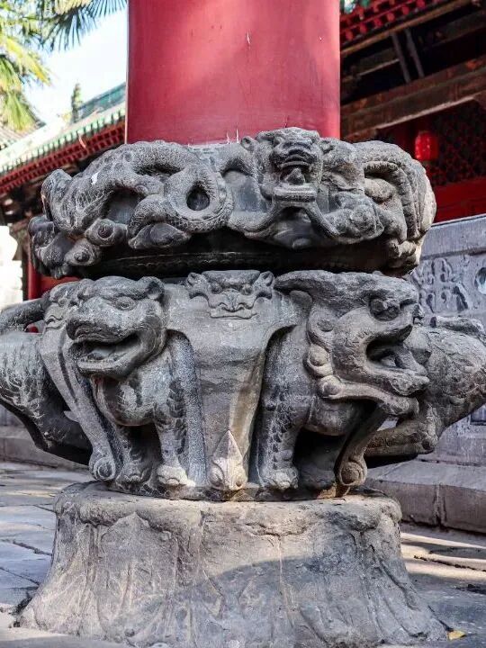 关林在细节上处处彰显皇家风格,连接仪门与启圣殿之间的“石狮甬道”青砖铺地,石板裙边,是明清两代皇帝、皇后拜祭关羽或朝廷遣官致祭时的专用步道,故又称石狮御道。甬道两侧的甬柱上雕刻大小石狮108尊,百狮百态。石狮圆润生动,毫无石刻的生硬之感,代表了当时中原石刻艺术的极高成就。