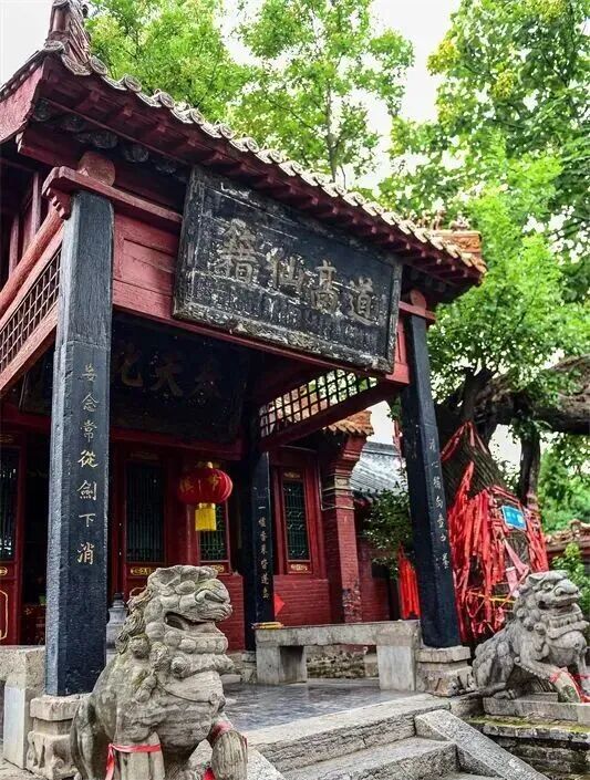 殿前古树环绕,青烟袅袅,掩映着朱红窗棂。殿内方形供台上为吕祖阁,阁内供奉吕祖像。再往后行,正殿、配殿、厢房等建筑依次展开,布局规整。此外,庙宇之内,另有一对石狮雄踞,十余通古碑林立,静默诉说着百年沧桑。