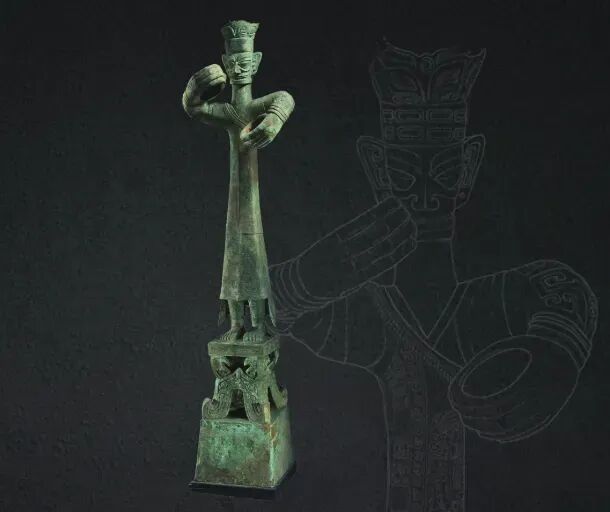 古蜀从来不是孤岛。3号坑出土的青铜顶尊人像,将中原礼器的尊与蜀地人像完美融合,表面的云雷纹、兽面纹与江中游盘龙城遗址的纹饰谱系一脉相承,这种文化嫁接现象揭示出古蜀文明并非孤立存在。