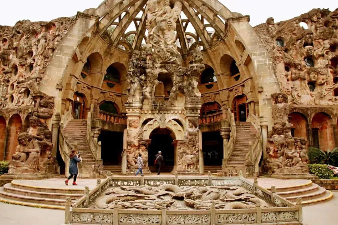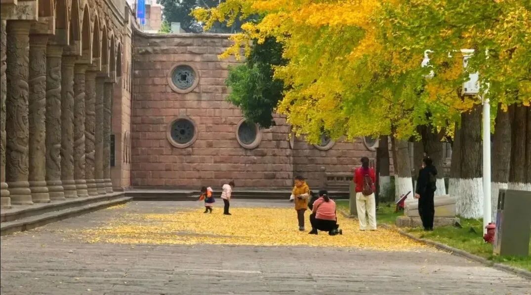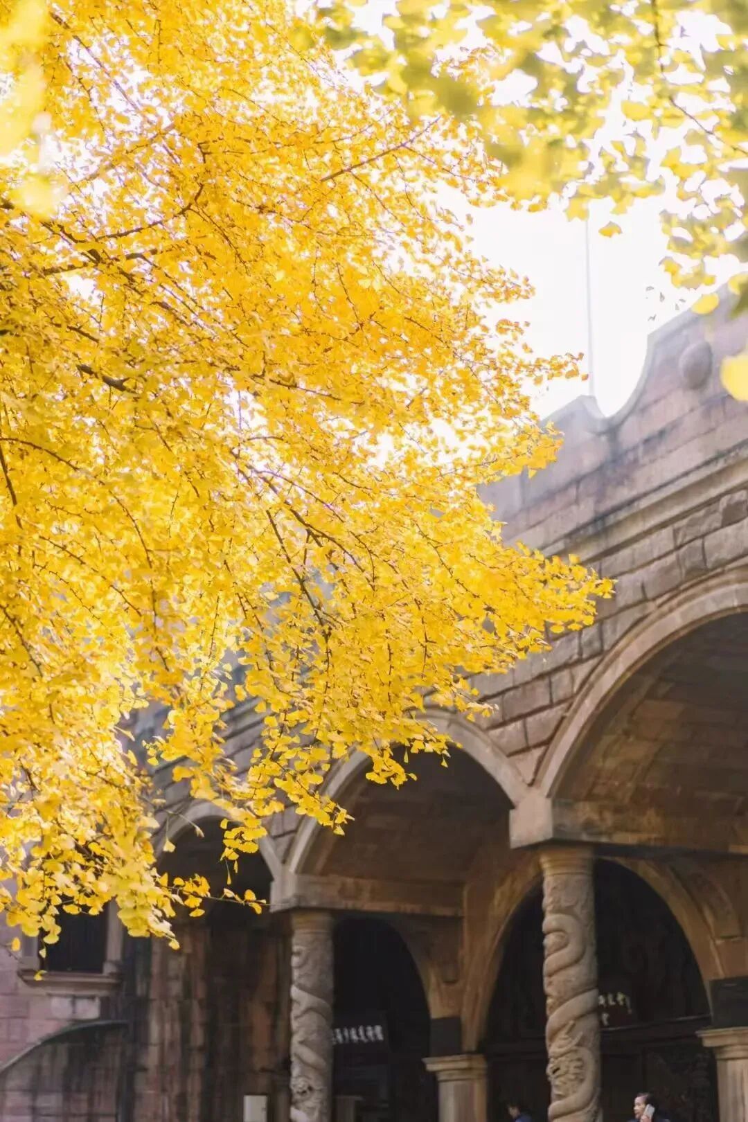 深秋时节,金黄的银杏叶飘落在充满艺术气息的石刻建筑旁,随手一拍,就是一张金色大片!