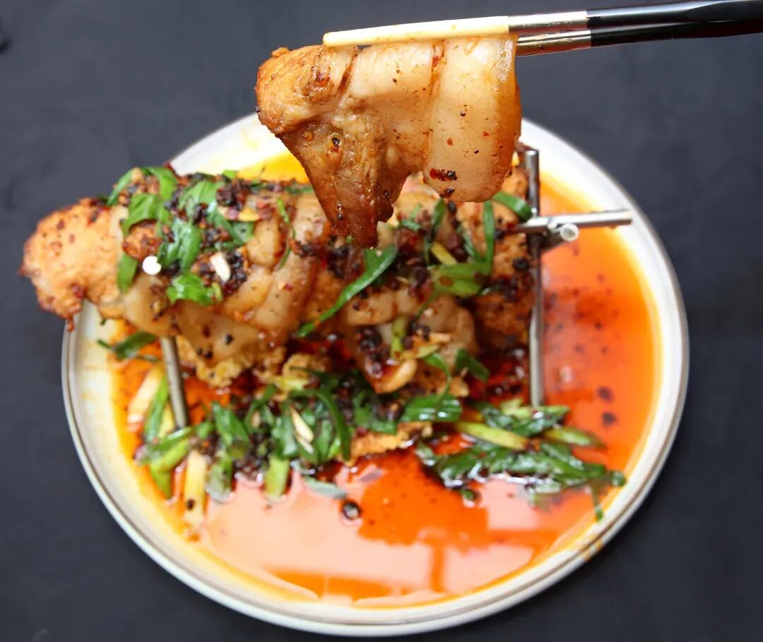连山回锅肉,那一片肉比手掌大、肥瘦相间的“二刀坐臀”,在郫县豆瓣与德阳酱油里翻滚,咸香下饭,是回锅肉界当之无愧的“豪横王者”。