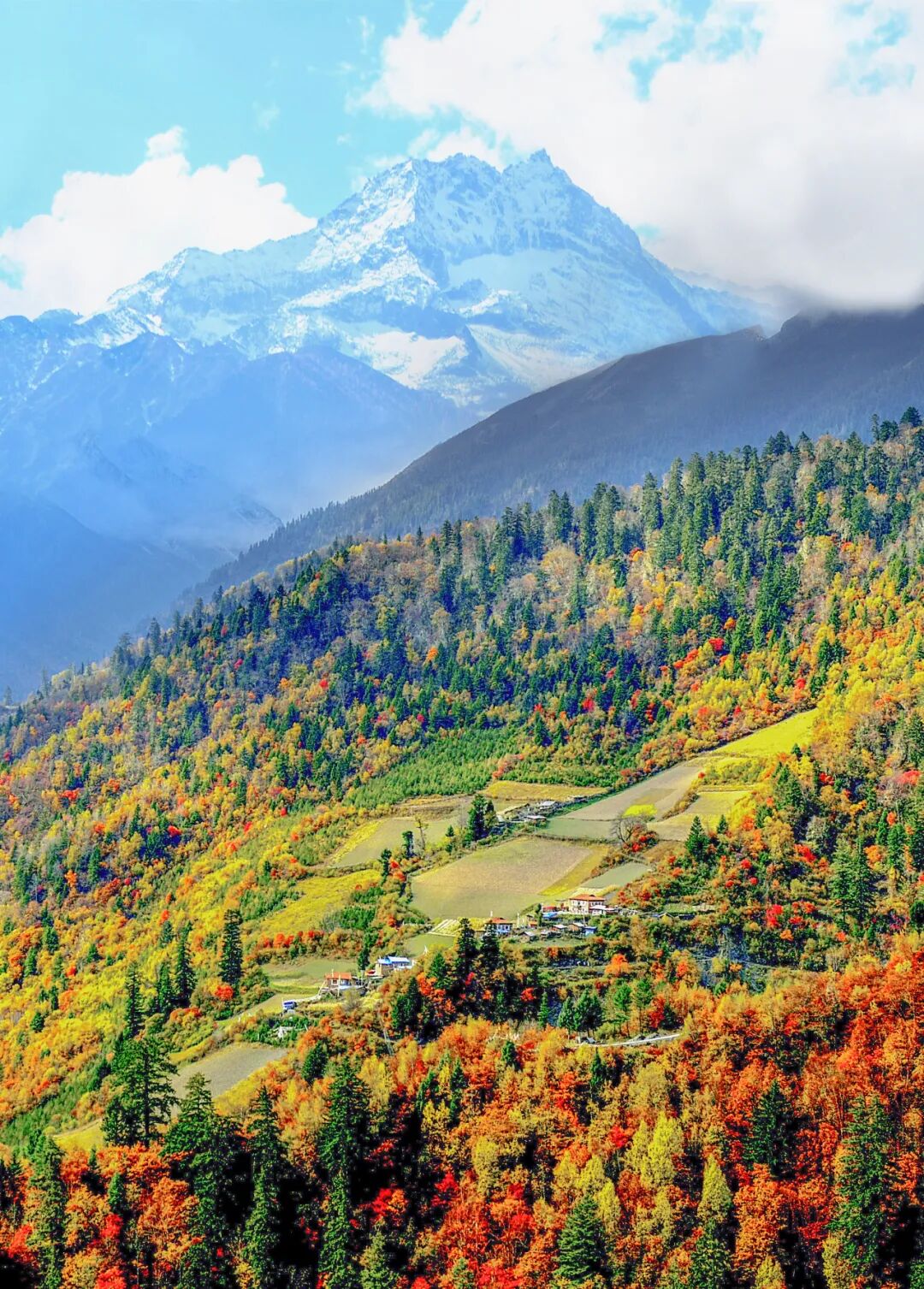 山顶是白雪纯净,山脚是彩林绚烂,在达古冰川,你可以见证冰雪与彩林同框的绝美景色